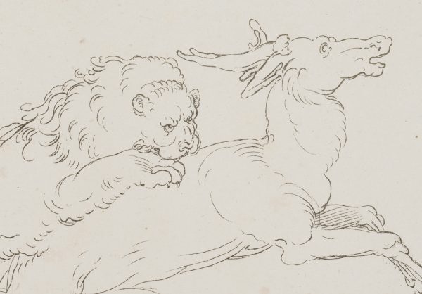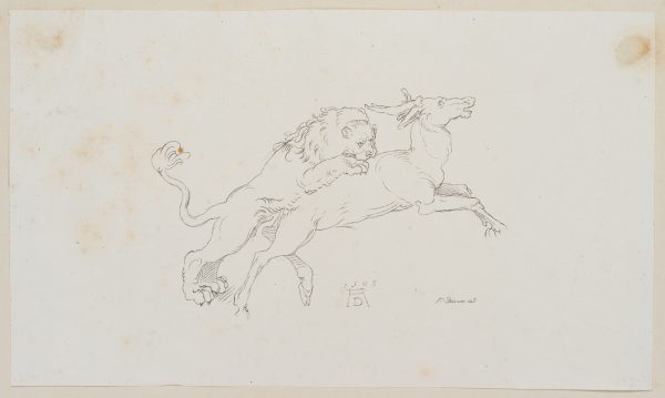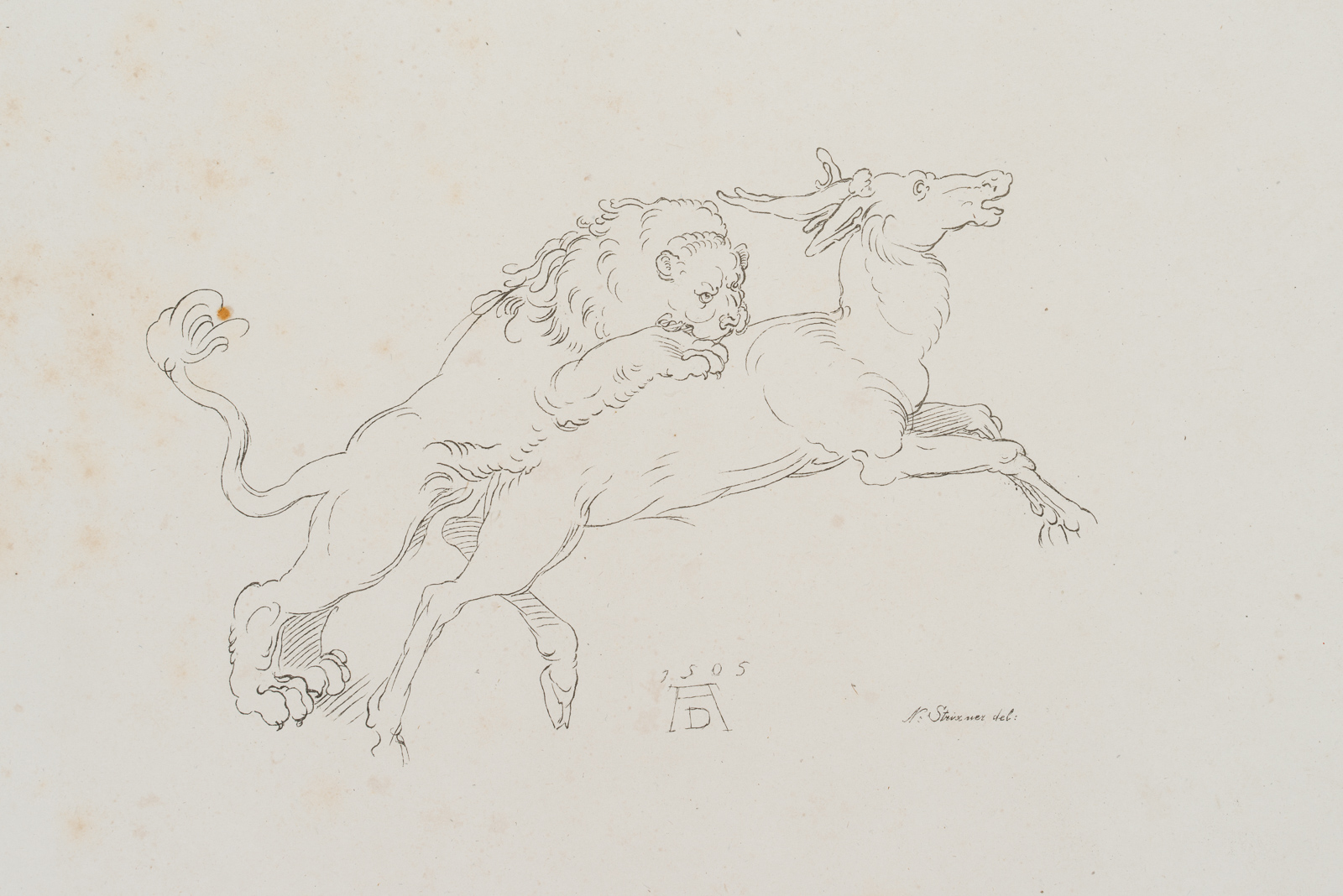 Johann Nepomuk Franz Xaver Strixner (1782 Altötting – 1855 Munich) after Albrecht Dürer (1471 Nuremberg – 1528 ibid.), Lion attacking a stag, incunabulum of lithography, Winkler No 965, 402, 1811-1816, c. 1811, Lithography with pen