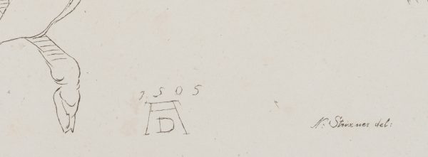 - Inscription: At the bottom of the image (centre): “1505 and below Dürer’s monogram, signed on the right: N: Strixner del:”, after a painting in Gr. Sammlung Munich by Albrecht Dürer / Winkler No. 965, 40.2, Dussler (Munich II), p. 149 No. XL,2″, Munich 1811-1816.
