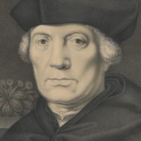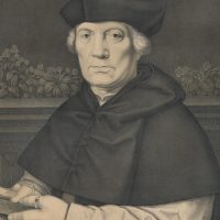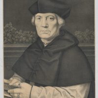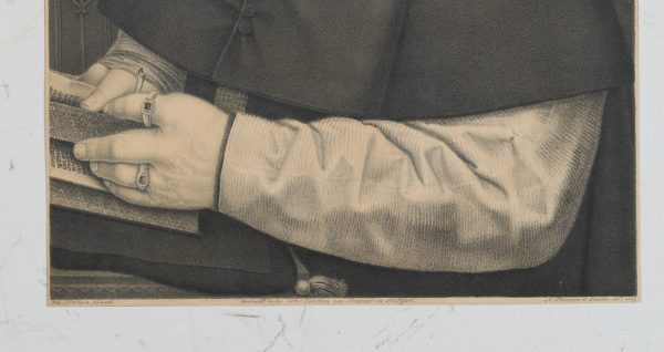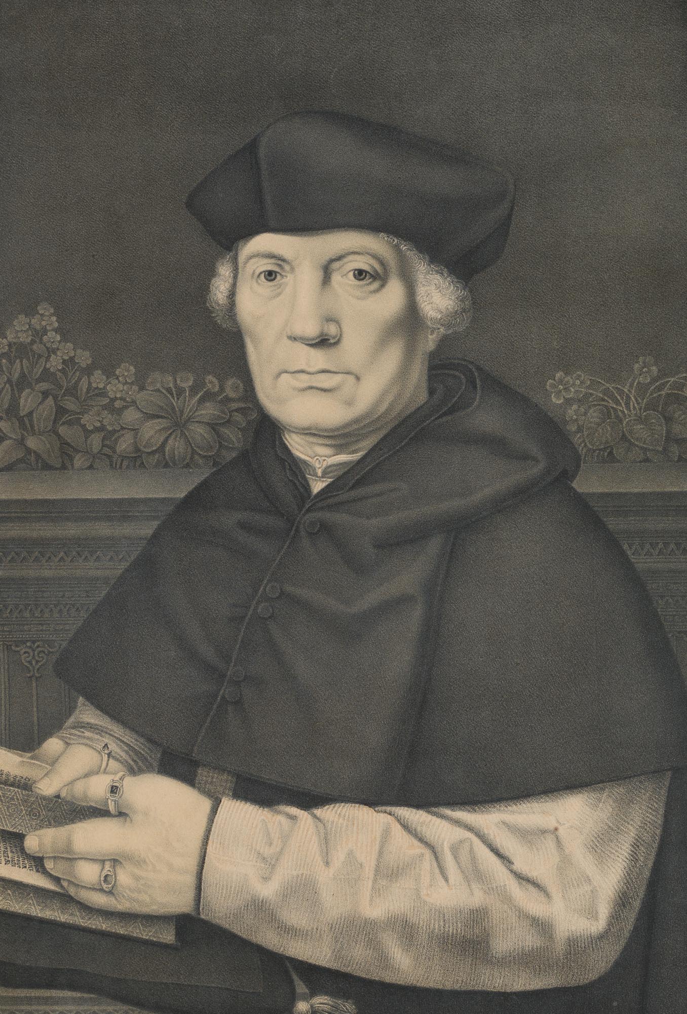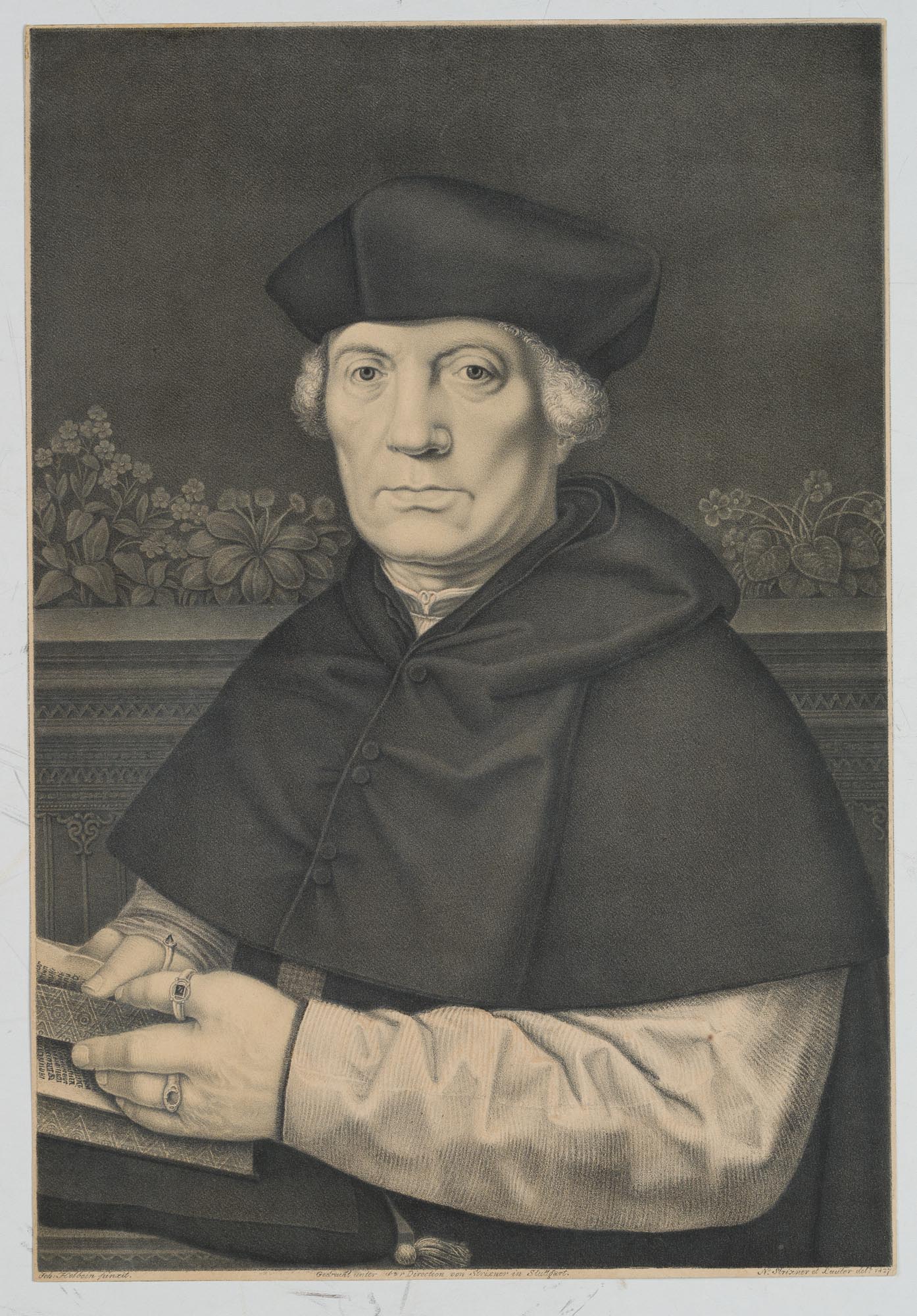 Johann Nepomuk Franz Xaver Strixner (1782 Altötting – 1855 München) nach Johann Hohlbein (16. Jahrhundert), Portrait des Niederländers Johann von Carondelet (16 Jh.), Erzbischof von Palermo, Kanzler von Flandern, Bruststück mit Blick frontal hin zum Betrachter, in einem Buch blätternd, 1827, Kreidelithographie