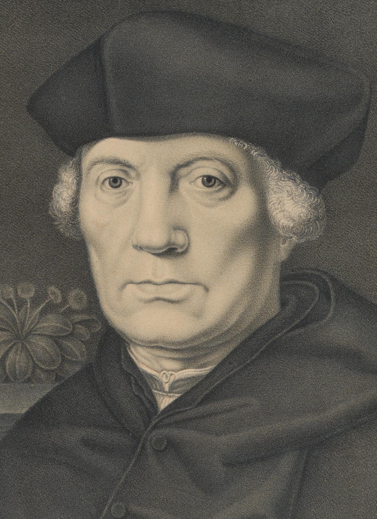 Johann Nepomuk Franz Xaver Strixner (1782 Altötting – 1855 Munich) after Johann Hohlbein (16th century), Portrait of the Dutchman John of Carondelet (16th century), Archbishop of Palermo, Chancellor of Flanders, bust with frontal view towards the viewer, leafing through a book, 1827, Lithography with chalk