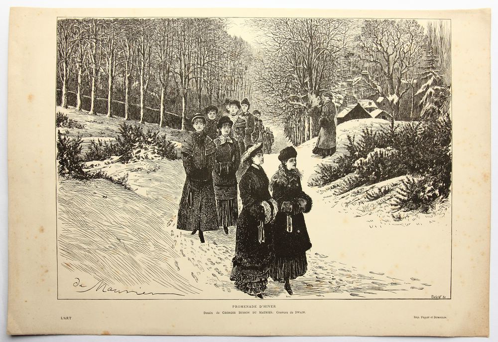 • Description: After an original by George Louis Palmella Busson DuMaurier (1834 Paris – 1896 ibid.). Young ladies in noble winter coats are walking in a long line through a snowy avenue. Signed by both artists at the lower margin of the image. Below titled and inscribed in French.
