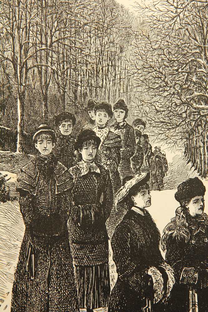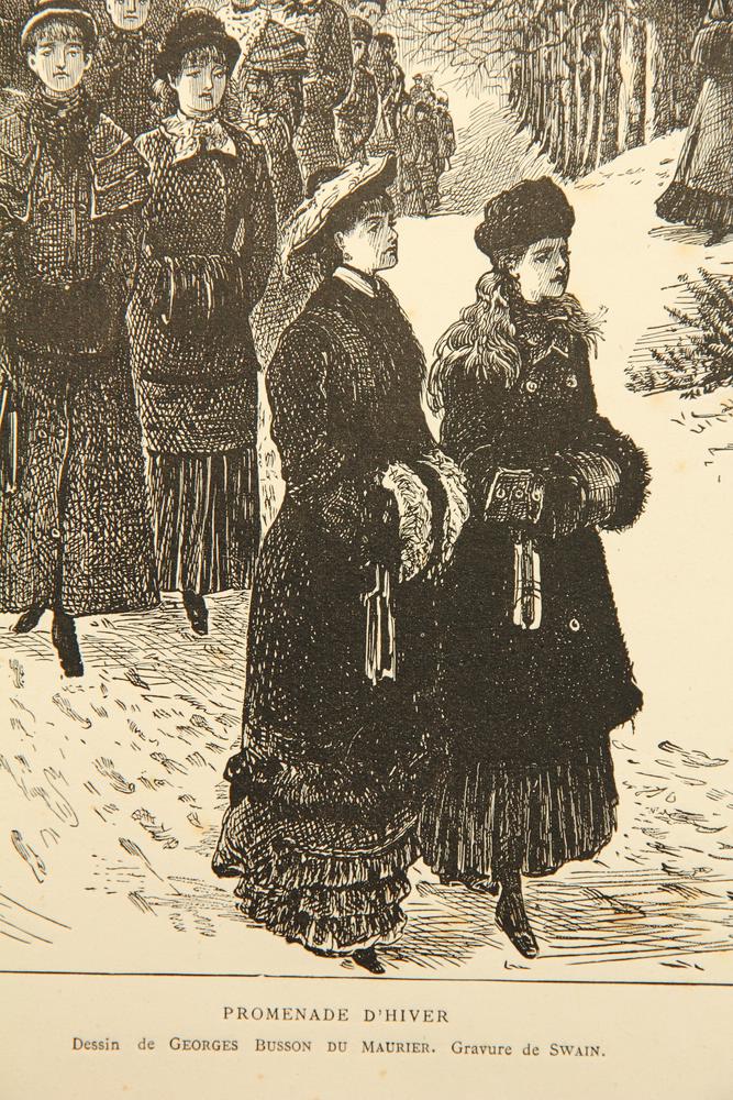 Nach einer Vorlage von George Louis Palmella Busson DuMaurier (1834 Paris – 1896 ebd.). Junge Damen in edlen Wintermänteln spazieren in langer Reihe durch eine verschneite Allee. Am unteren Rand der Darstellung im Druckstock von beiden Künstlern signiert. Darunter in französischer Sprache betitelt und bezeichnet.