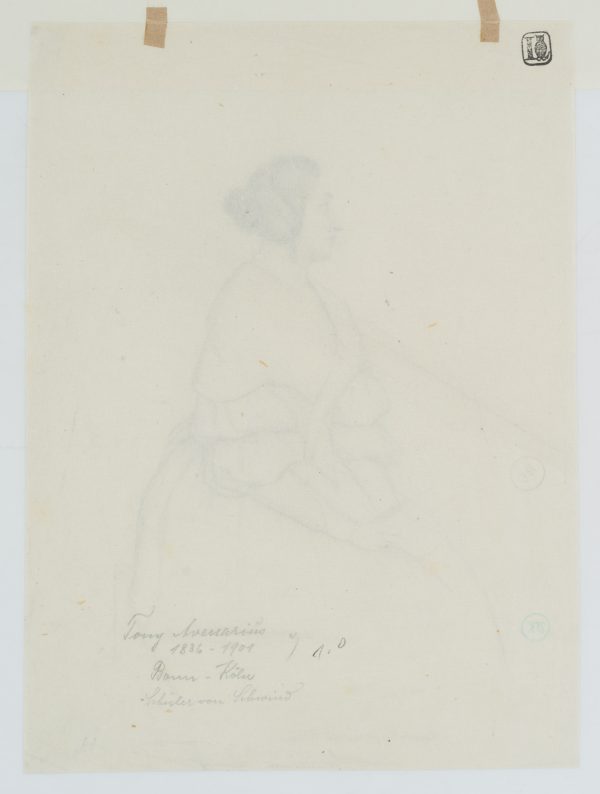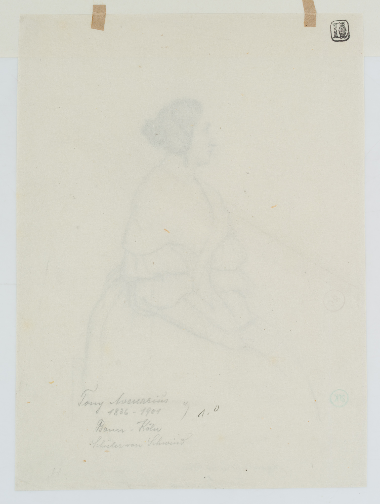 - Beschreibung: Karl Anton Josef „Tony“ Avenarius auch Toni Avenarius (Pseudonym: Antonius Hafermann) war ein deutscher Buchillustrator, Grafiker, Zeichner, Komponist und Librettist. Er studierte an der Kunstakademie München und wurde Mitarbeiter in den Ateliers von Gisbert Flüggen sowie Erich Corres. 1861 zog er nach Köln, wo er Inhaber einer lithografischen Werkstatt wurde. Das vorliegende Blatt ist unterhalb der Zeichnung, sowie rückseitig und auf dem Blattträger mit dem Namen der Dargestellten und des Künstlers beschriftet. Rückseitig mit Sammlerstempel Initiale “I” mit Eule (Sammlung Ines Kaps, Leipzig, L3551).