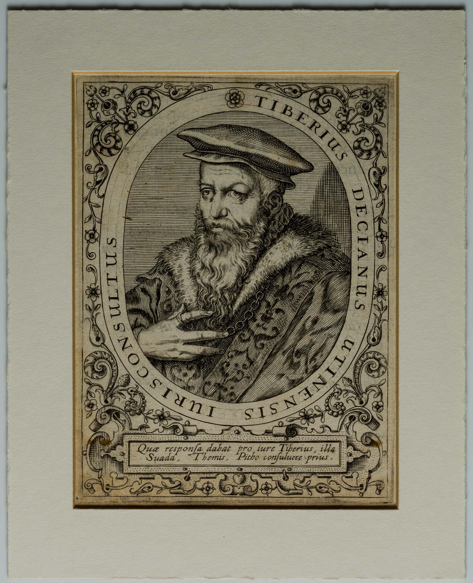 Bezeichnet innerhalb des Ovals mit dem Titel und unten in der Kartusche mit “Quae responda dabat pro jure Tiberius, illa / Suada, Themis, Pitho consuluere prius”. Verso mit lateinischem Text. Büstenporträt des Tiberio Deciani (1509 Udine-1582), italienischer Jurist, in der Tradition des Renaissance Humanismus. Seine Arbeit war in vielen Feldern innovativ, den größten Beitrag leistete er im Strafrecht. In seinem “Tractatus criminalis” (1590 veröffentlicht), beschäftigt er sich als erster Autor mit allgemeinen Prinzipien des Strafrechts. Er trägt einen Umhang mit Pelzkragen, Kette und Hut; dargestellt in einem beletterten Oval; darunter eine beschriftete Tafel mit Beschlagwerk. Illustration aus “Icones quinquaginta virorum illustrium, doctrina & eruditione præstantium” (Frankfurt am Mein: Theodoor de Bry, 1597), S. 136.