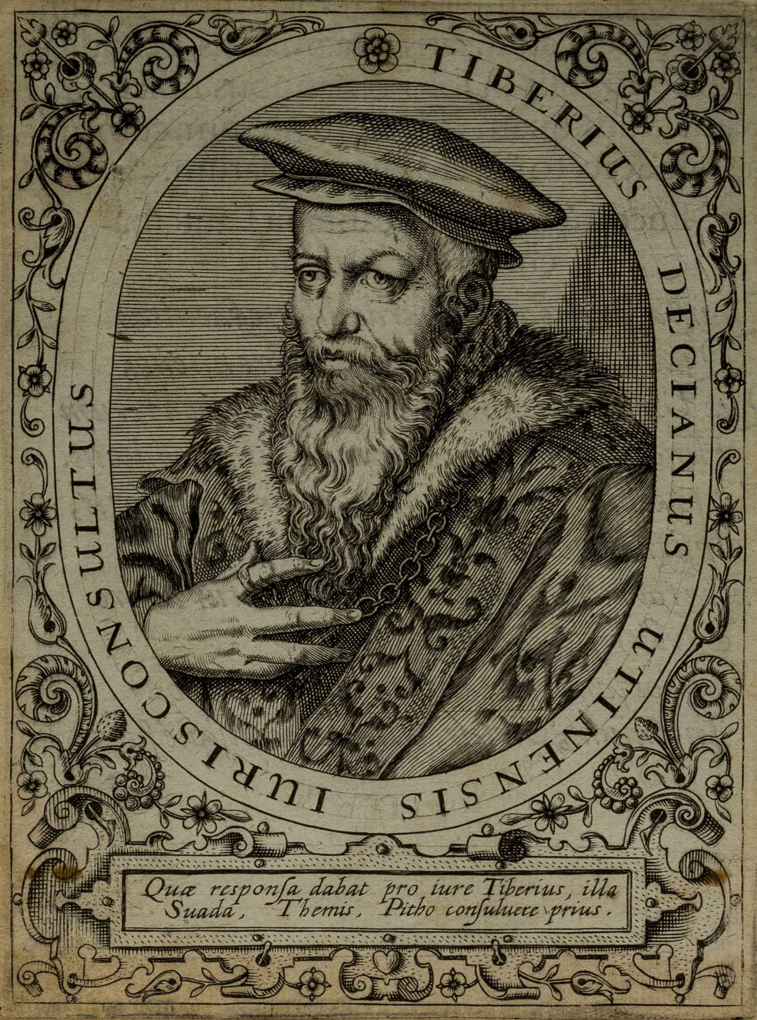 • Description: Inscribed within the oval with the title and below in the cartouche with “Quae responda dabat pro jure Tiberius, illa / Suada, Themis, Pitho consuluere prius”. Verso with Latin text. Bust portrait of Tiberio Deciani (1509 Udine-1582), Italian jurist, in the tradition of Renaissance humanism. His work was innovative in many fields, the greatest contribution being in criminal law. In his “Tractatus criminalis” (published 1590), he is the first author to deal with general principles of criminal law. He wears a cloak with fur collar, chain and hat; depicted in a lettered oval; below an inscribed panel with hardware. Illustration from “Icones quinquaginta virorum illustrium, doctrina & eruditione præstantium” (Frankfurt am Mein: Theodoor de Bry, 1597), p. 136.