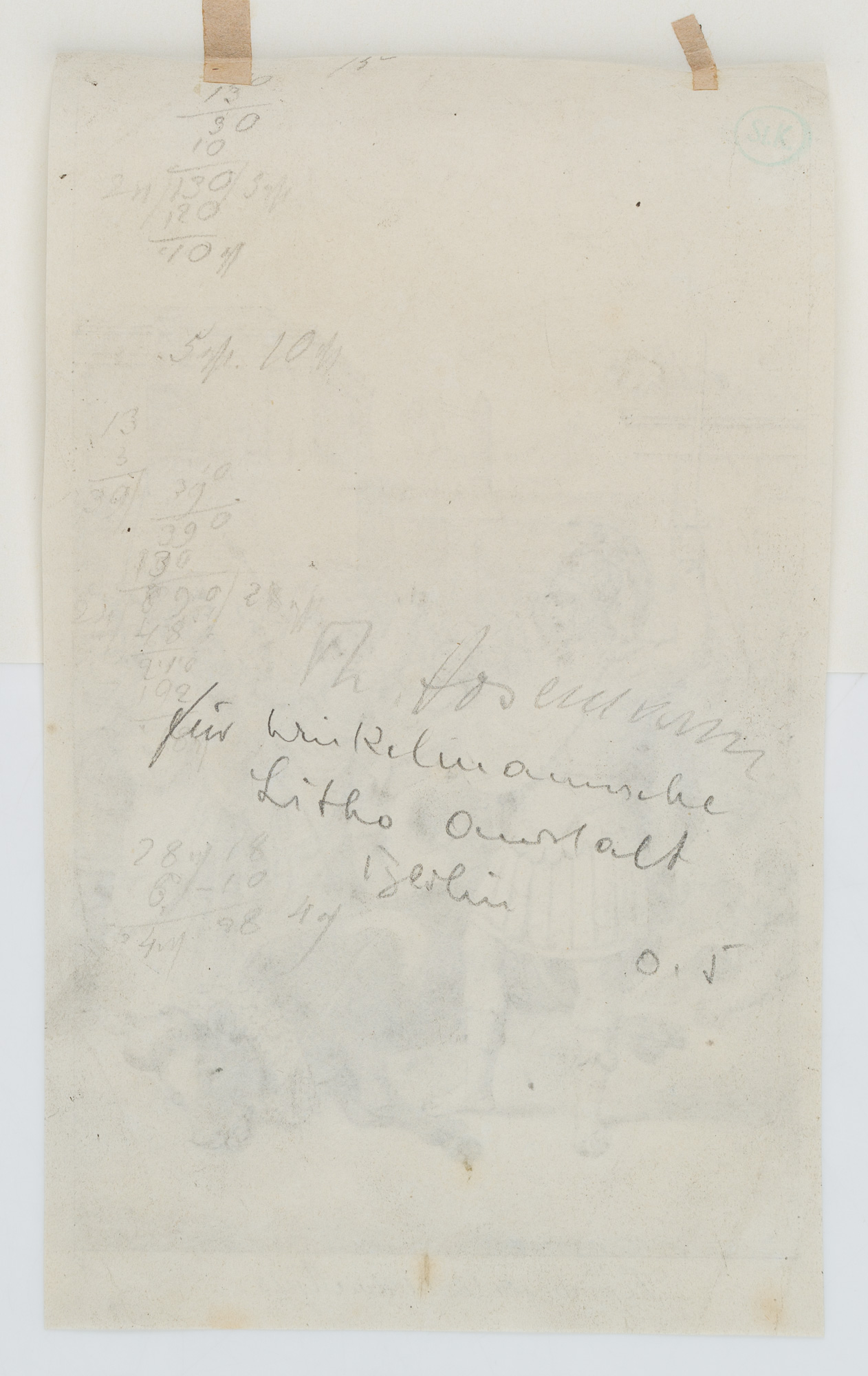 - Bezeichnung: Unterhalb der Zeichnung beschriftet. Rückseitig mit rundem Sammlerstempel, “St. K” (Stefan Kaps, Enkel und Erbe von Erhard Kaps, Leipzig, L.4642).