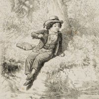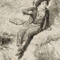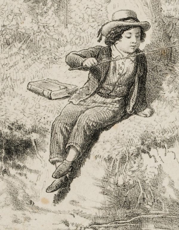 - Beschreibung: Aus der Hand Theodor Hosemanns, deutscher Graphiker, Kunstmaler, Zeichner, Illustrator und Karikaturist. Er gilt neben Adolf Menzel als wichtigster Lithograph in der Frühzeit dieser Technik in Berlin. Zur Darstellung: Vermutlich eine Kinderbuchillustration, die einen jungen Angler an einem Bach zeigt. Er wird beobachtet von einem Mann und einer Frau im Hintergrund. In der linken unteren Ecke der Darstellung monogrammiert und datiert: “TH 1854”.