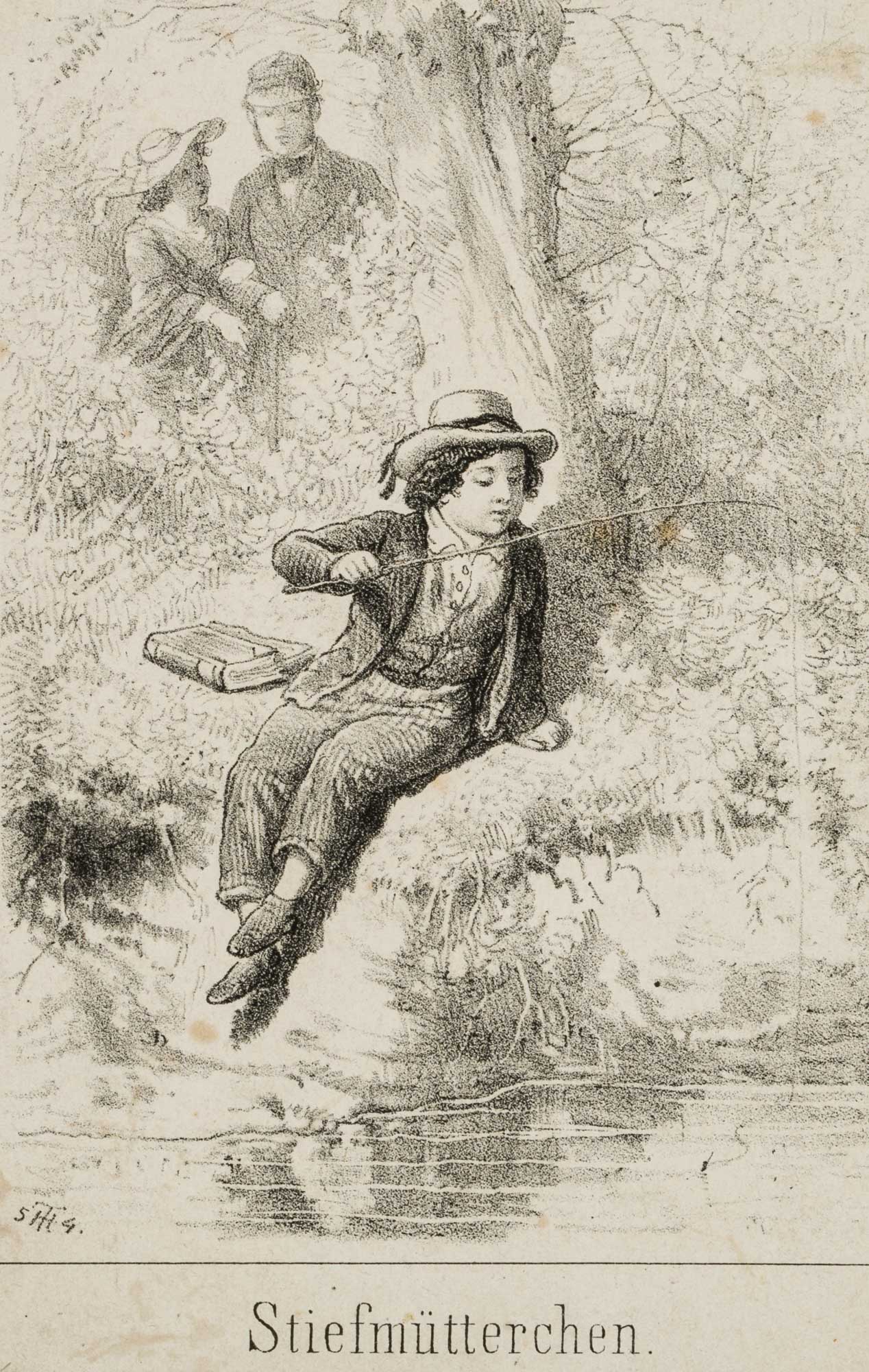 - Description: From the hand of Theodor Hosemann, German graphic artist, painter, draughtsman, illustrator and caricaturist. Along with Adolf Menzel, he is considered the most important lithographer in the early days of this technique in Berlin. About the picture: Probably a children’s book illustration showing a young angler at a brook. He is observed by a man and a woman in the background. Monogrammed and dated in the lower left corner: “TH 1854”.
