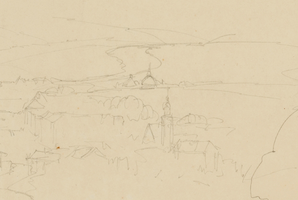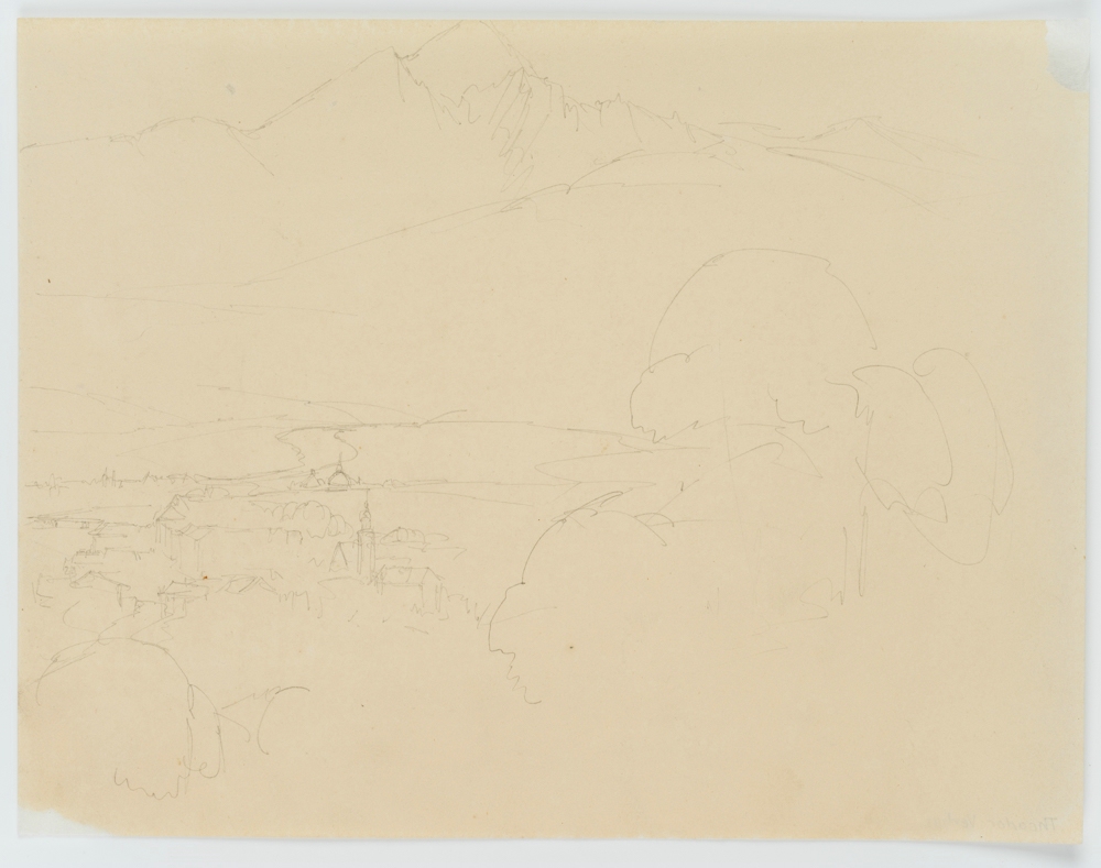 • Description: From an elevated position, the artist looks into a wide river valley in front of a rugged mountain range. Near the river, the buildings of a town can be seen. It is probably a sketch from a journey in the Alpine region, perhaps in Tyrol.