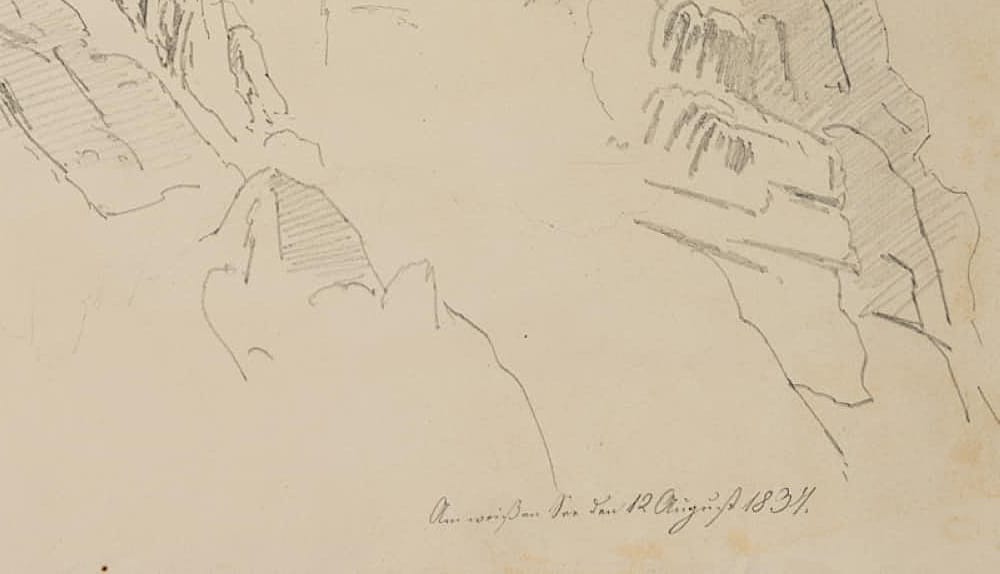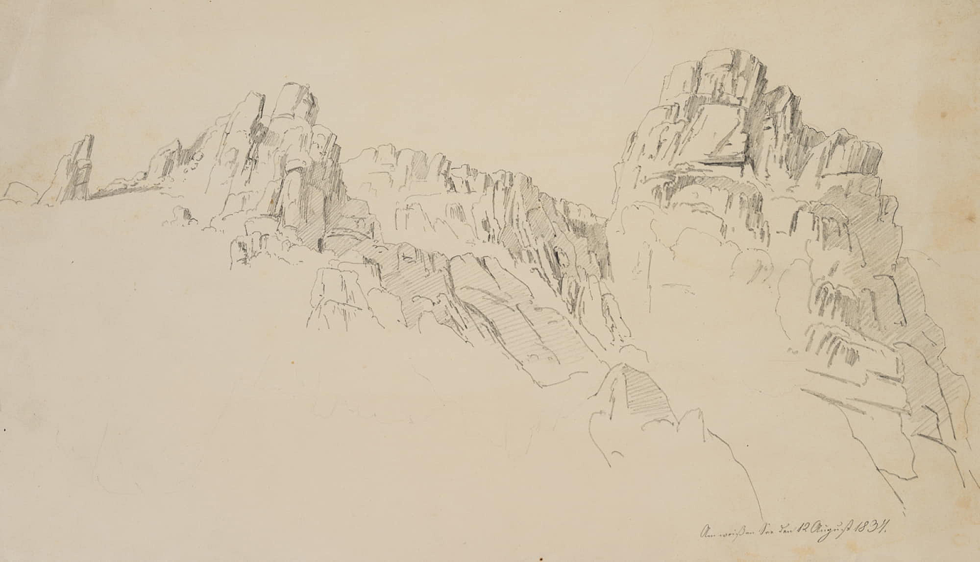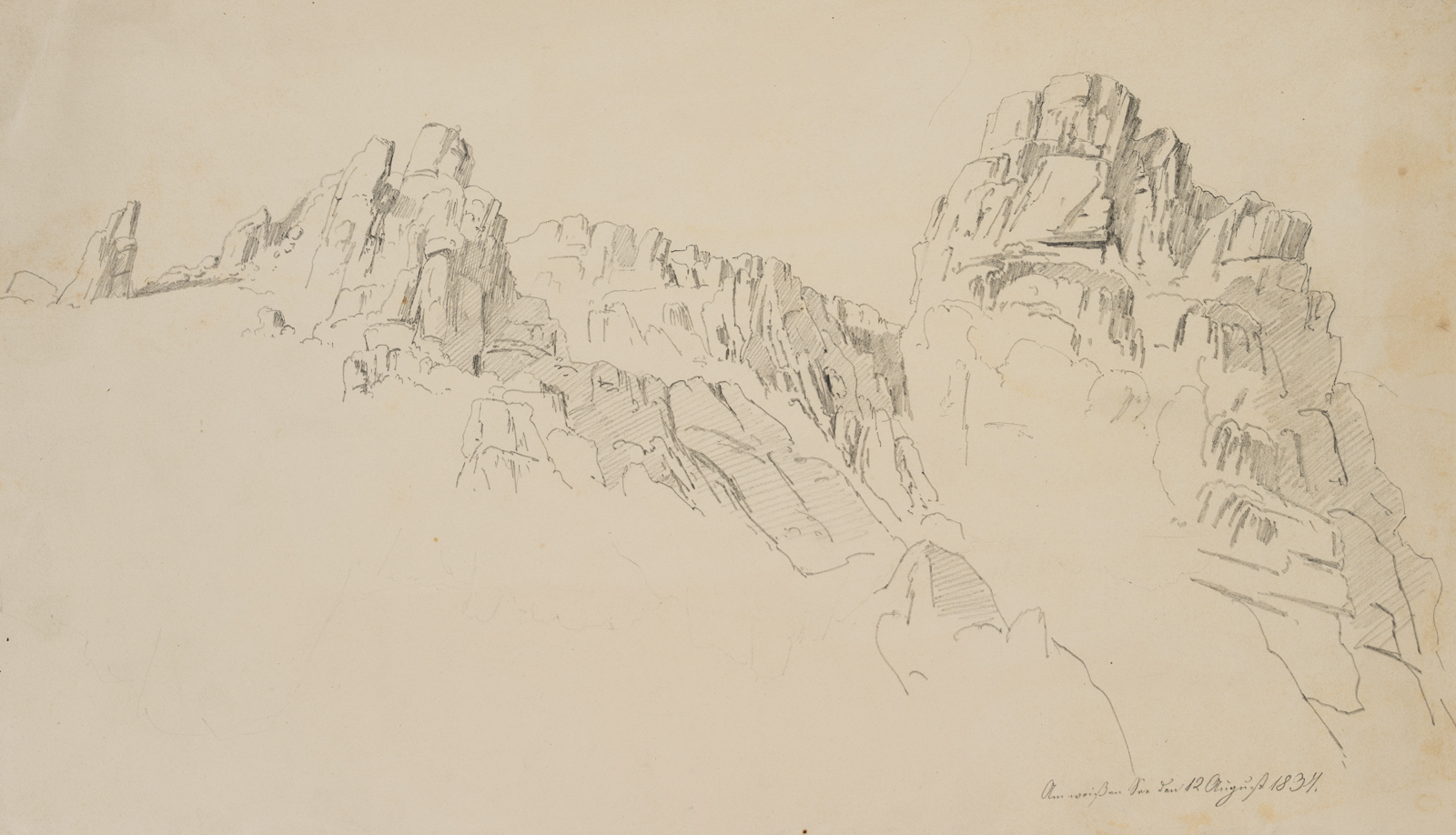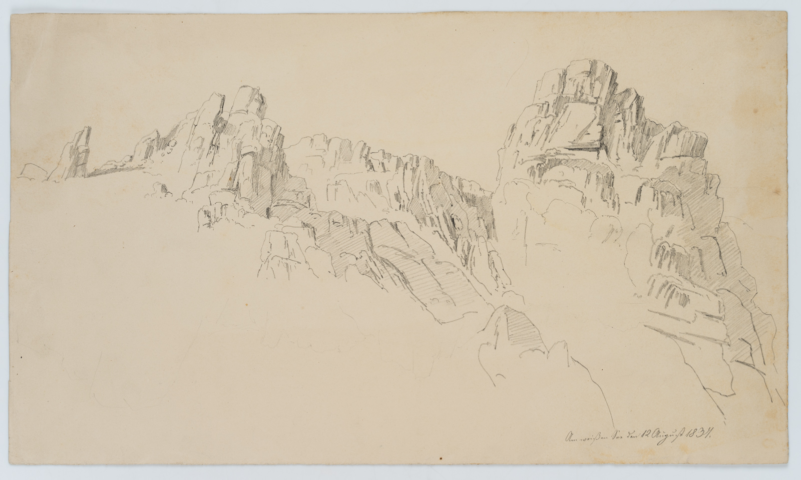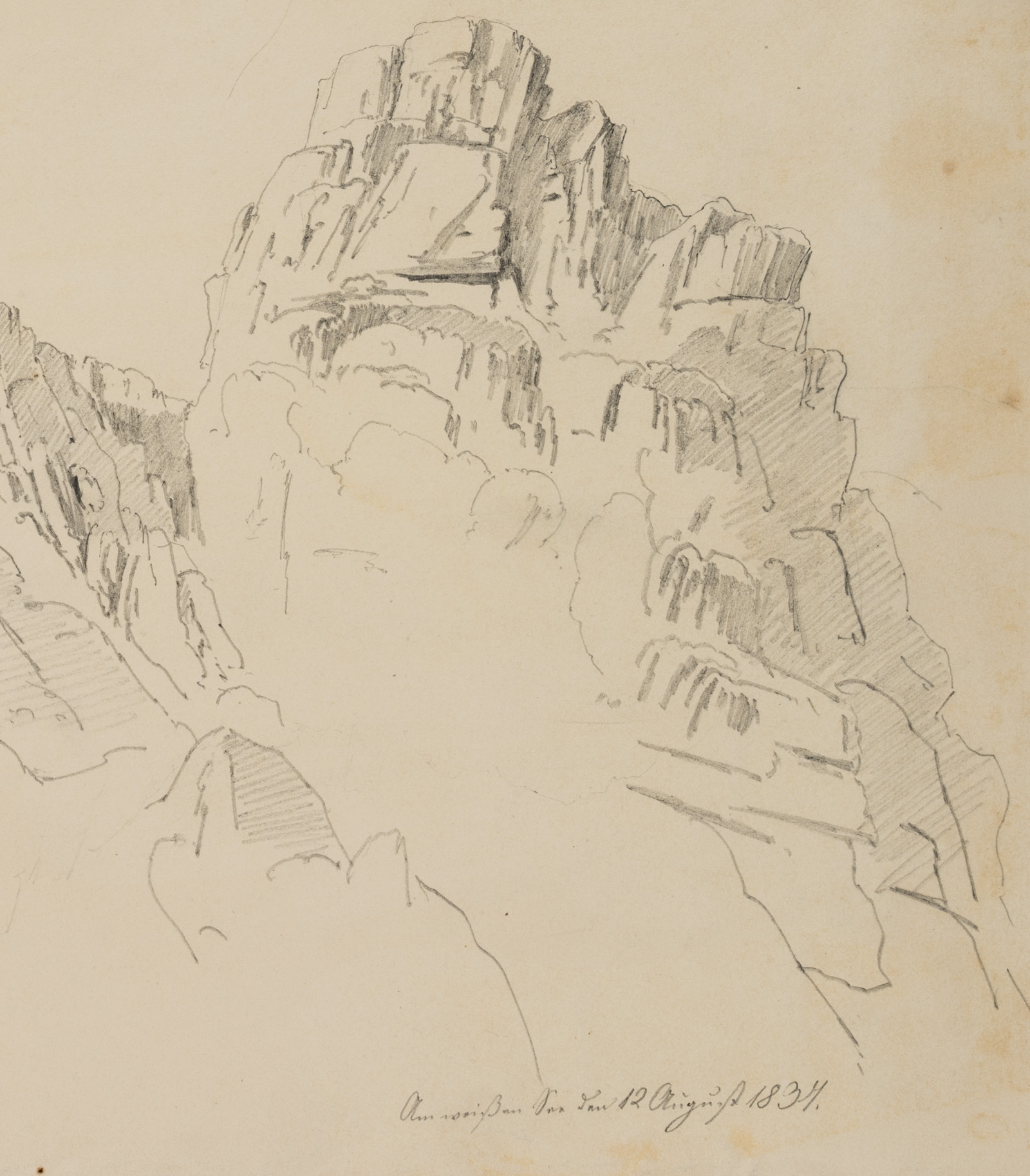- Beschreibung: Detailgenaue Skizze zerklüfteter Felsen. Vermutlich während einer Reise in der Alpenregion, Südtirol, Tirol, Österreich oder der Schweiz entstanden.