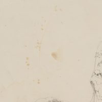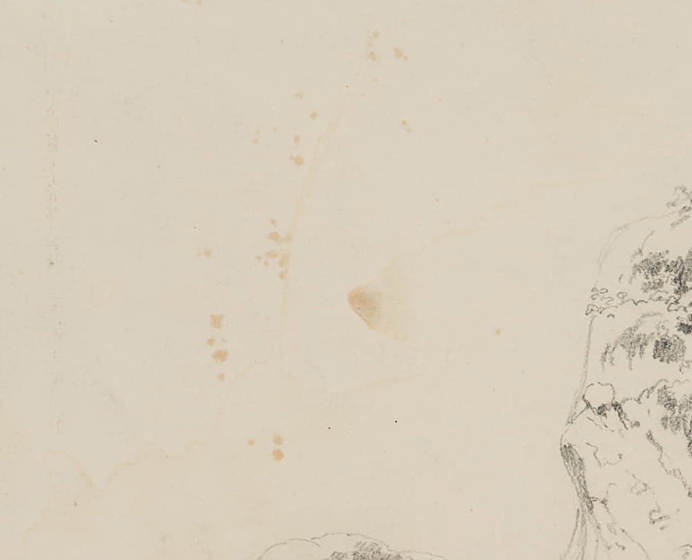- Zustand: Guter Zustand. Vereinzelt fettfleckig. Stellenweise schwach verschmutzt. Die linke Blattkante ist geringfügig durch die Herauslösung aus einer Skizzenbuchbindung beschädigt.