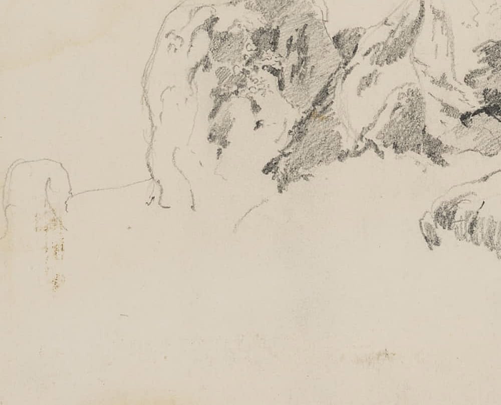 - Beschreibung: Naturskizze eines mit Gräsern und Büschen bewachsenen Felsens. Stellenweise sind Farbnotizen zu erkennen.
