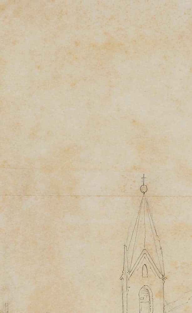 • Beschreibung: Skizze des Turmes mit großem Kruzifix einer kleinen Kirche vor alpinem Gebirge.