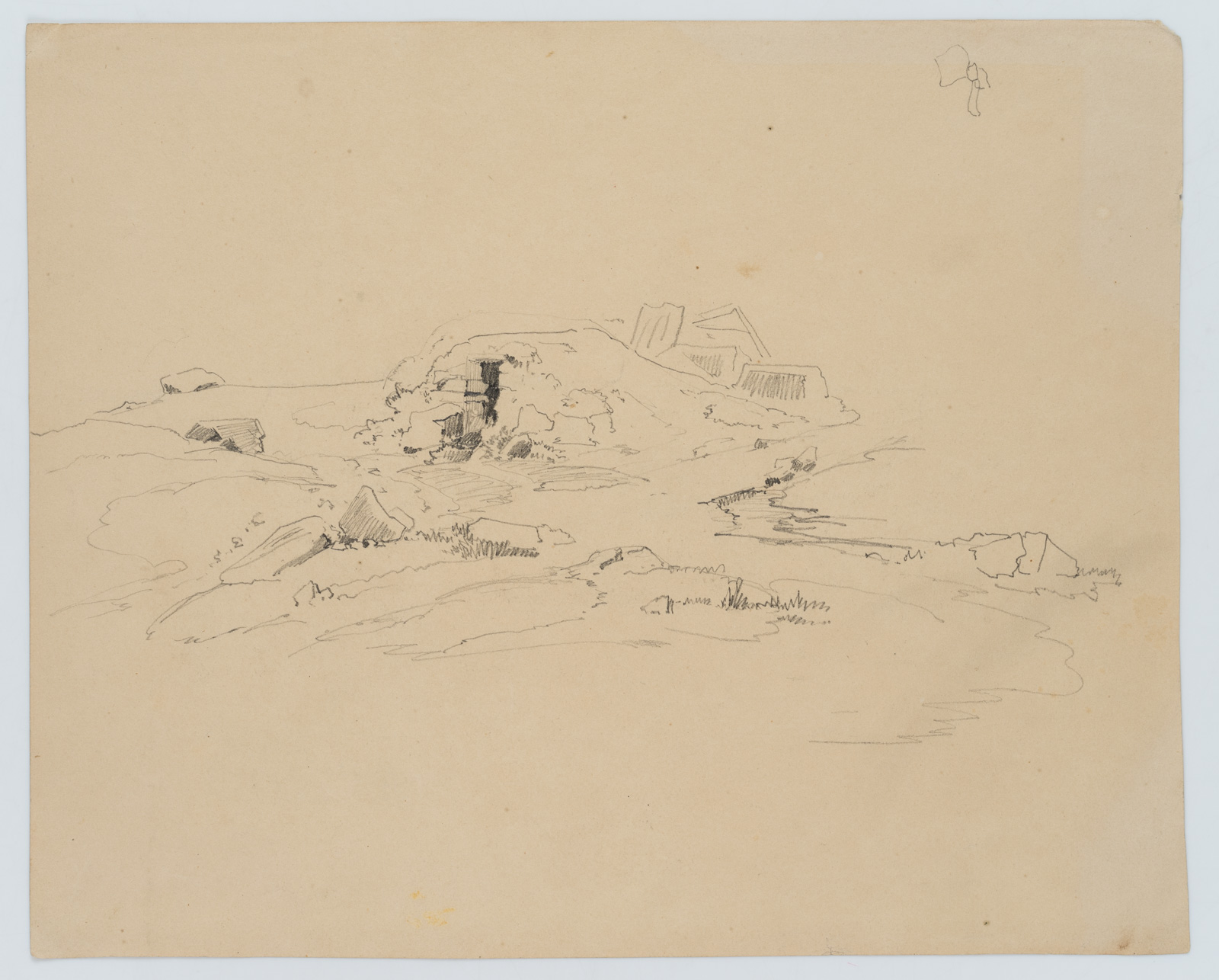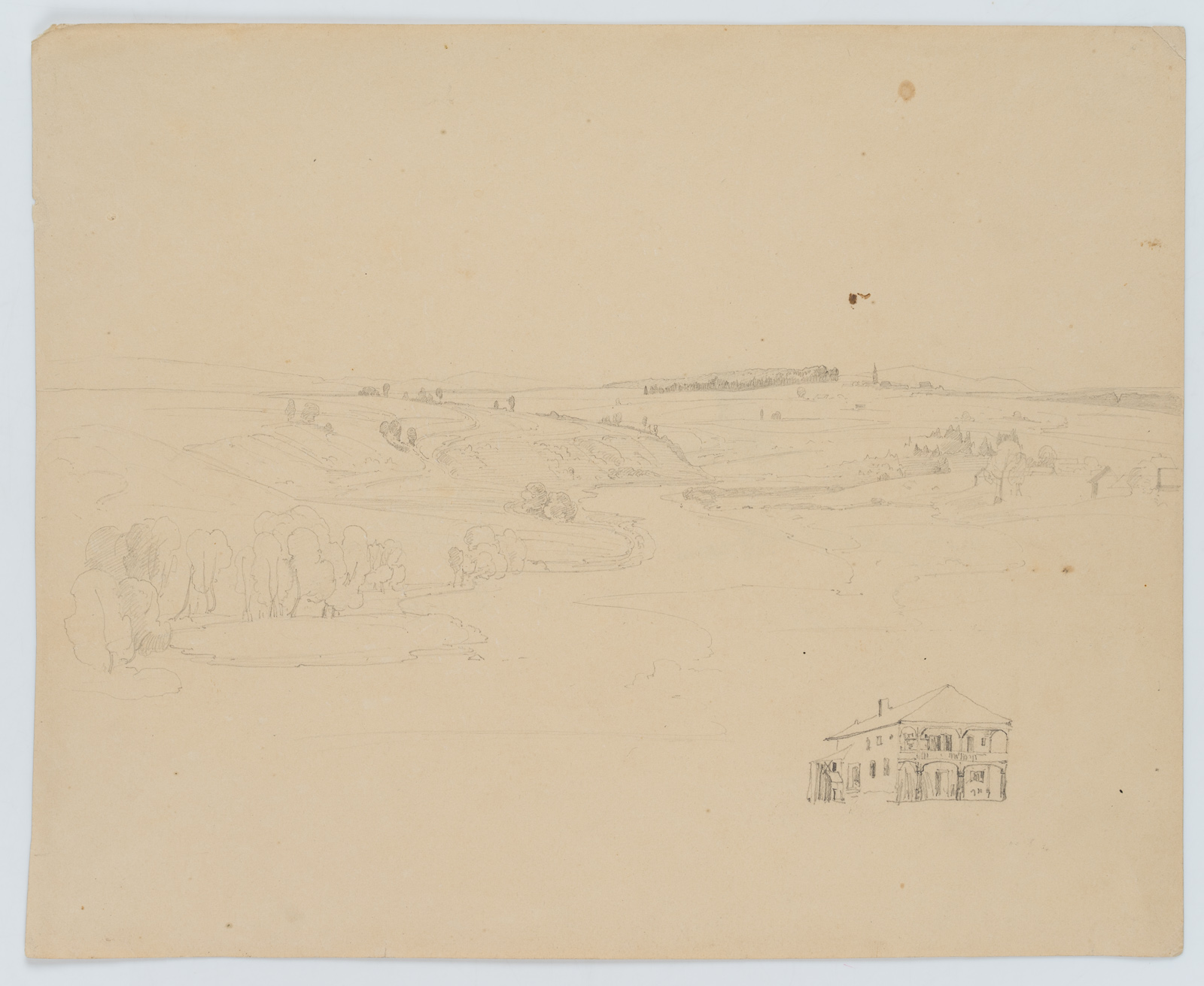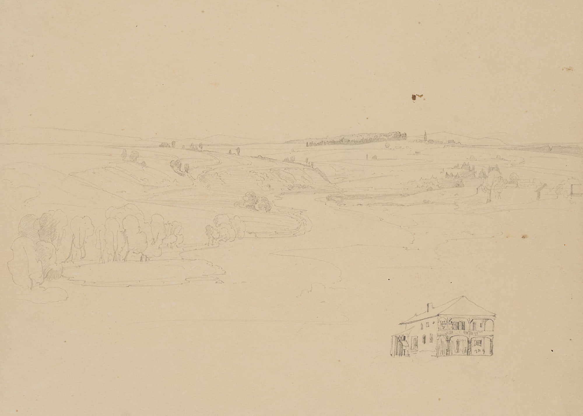 • Description: Sketchy landscape painting of a wide plain with gentle hills. In front a small lake with trees is sketched. A house is sketched at the lower right. On the verso is a nature study at a crossroads.
