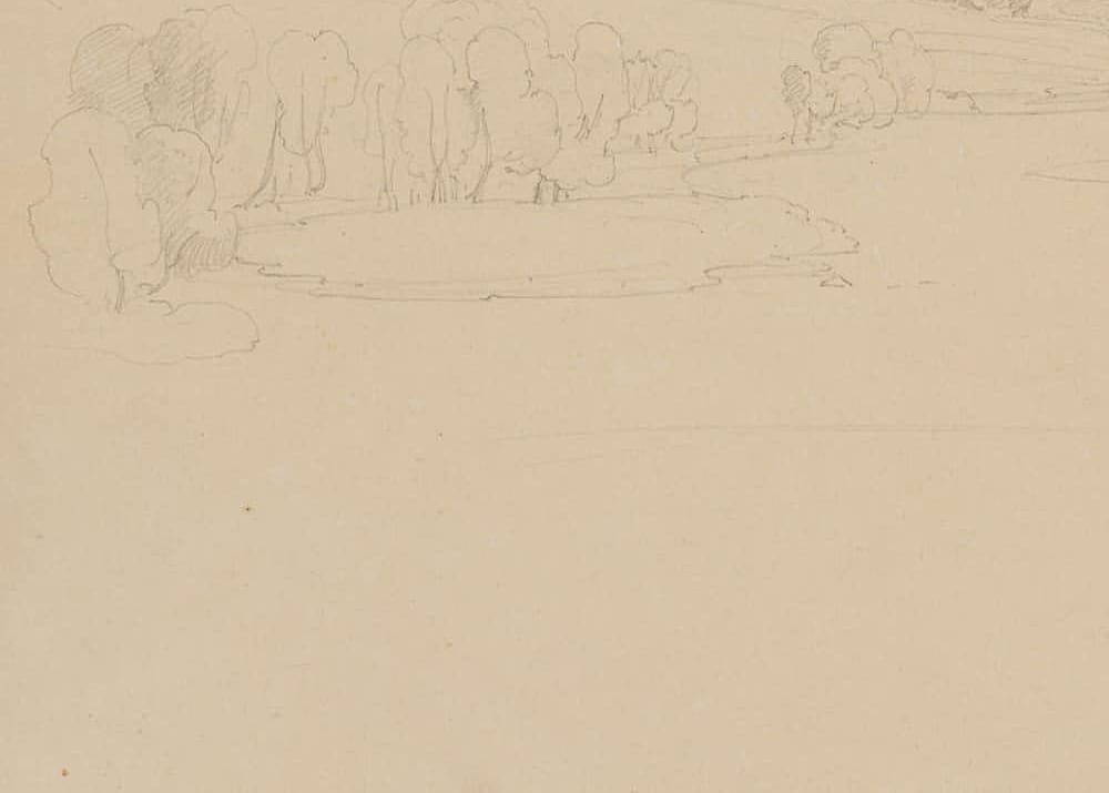 • Beschreibung: Skizzenhaftes Landschaftsbild einer weiten Ebene mit sanften Hügeln. Vorne ist ein kleiner See mit Bäumen skizziert. Unten rechts ist ein Haus skizziert. Verso befindet eine Naturstudie an einer Wegkreuzung.