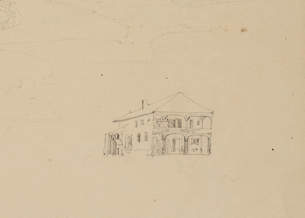 Skizzenhaftes Landschaftsbild einer weiten Ebene mit sanften Hügeln. Vorne ist ein kleiner See mit Bäumen skizziert. Unten rechts ist ein Haus skizziert. Verso befindet eine Naturstudie an einer Wegkreuzung. Ihre Ausbildung zur Künstlerin bei einigen der namhaftesten Künstlern ihrer Zeit, Karl Rottmann, Christian Morgenstern und Albrecht Adam, verdankte Therese Weber der Förderung ihres Onkels General Freiherr von Weber. Nach dem Tod ihres Vaters nahm dieser Therese bei sich auf und erkannte das Talent und die Neigung des Mädchens. Die Künstlerin bildete sich auf dem Gebiet der Landschaftsmalerei und Tiermalerei und beschäftigte sich mit modernen Sprachen sowie mit Geschichte und Literatur. Bei zahlreichen Reisen ins Elsass, nach Lothringen und ins Bayerische Inntal zeichnete und malte sie die Natur. Bei einer Reise an den Tegernsee lernte sie den Botaniker August Max Einsele kennen, der sie zur akkuraten Zeichnung der Pflanzenwelt und zur Erstellung eines malerischen Herbariums inspirierte. Therese Weber brillierte als Pflanzenmalerin und veröffentlichte etliche Sammelwerke zur heimischen Flora, besonders der Alpenländer. Die Studien nutze sie zudem selbst zur Dekoration von Fächern. Auch im späteren Leben begab die Künstlerin sich häufig auf Reisen, bei denen sie von einer adoptierten Waise begleitet wurde. Sie bereiste Italien, Frankreich und die Schweiz und nahm am gesellschaftlichen Leben teil. Im Alter von 62 Jahren erlag sie der Diphterie und verstarb am 30. Dezember 1875.