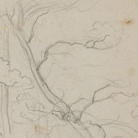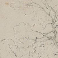 - Description: Sketch of a group of trees with gnarled branches and trunks.