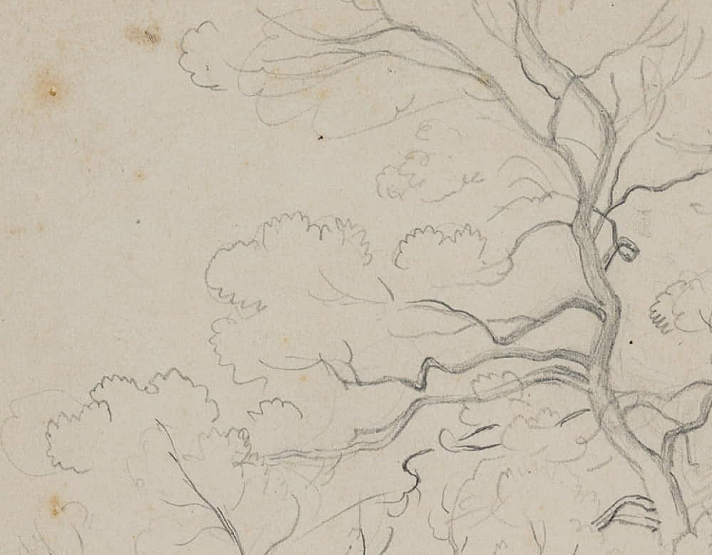 - Beschreibung: Skizze einer Baumgruppe mit knorrigen Ästen und Stämmen.