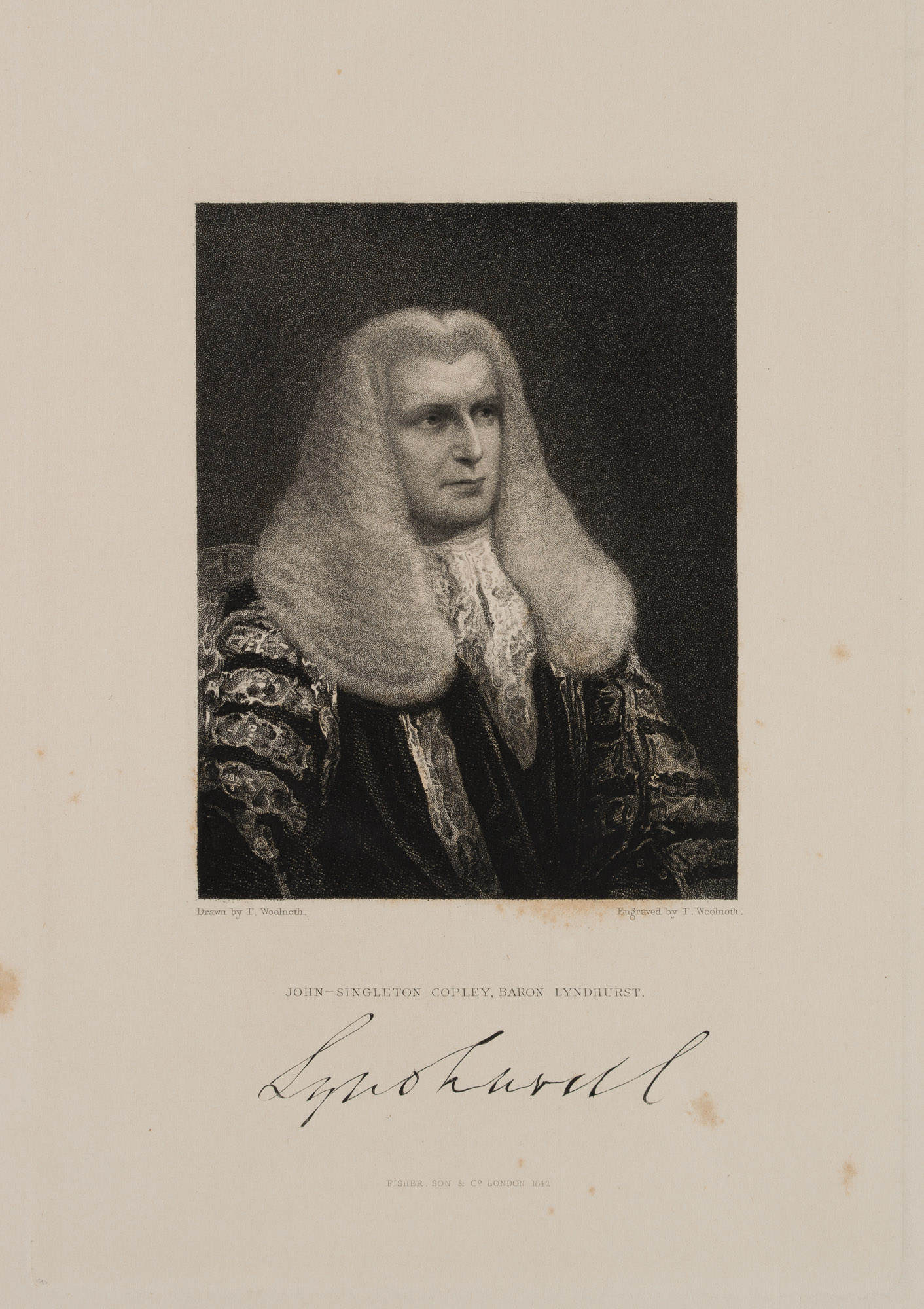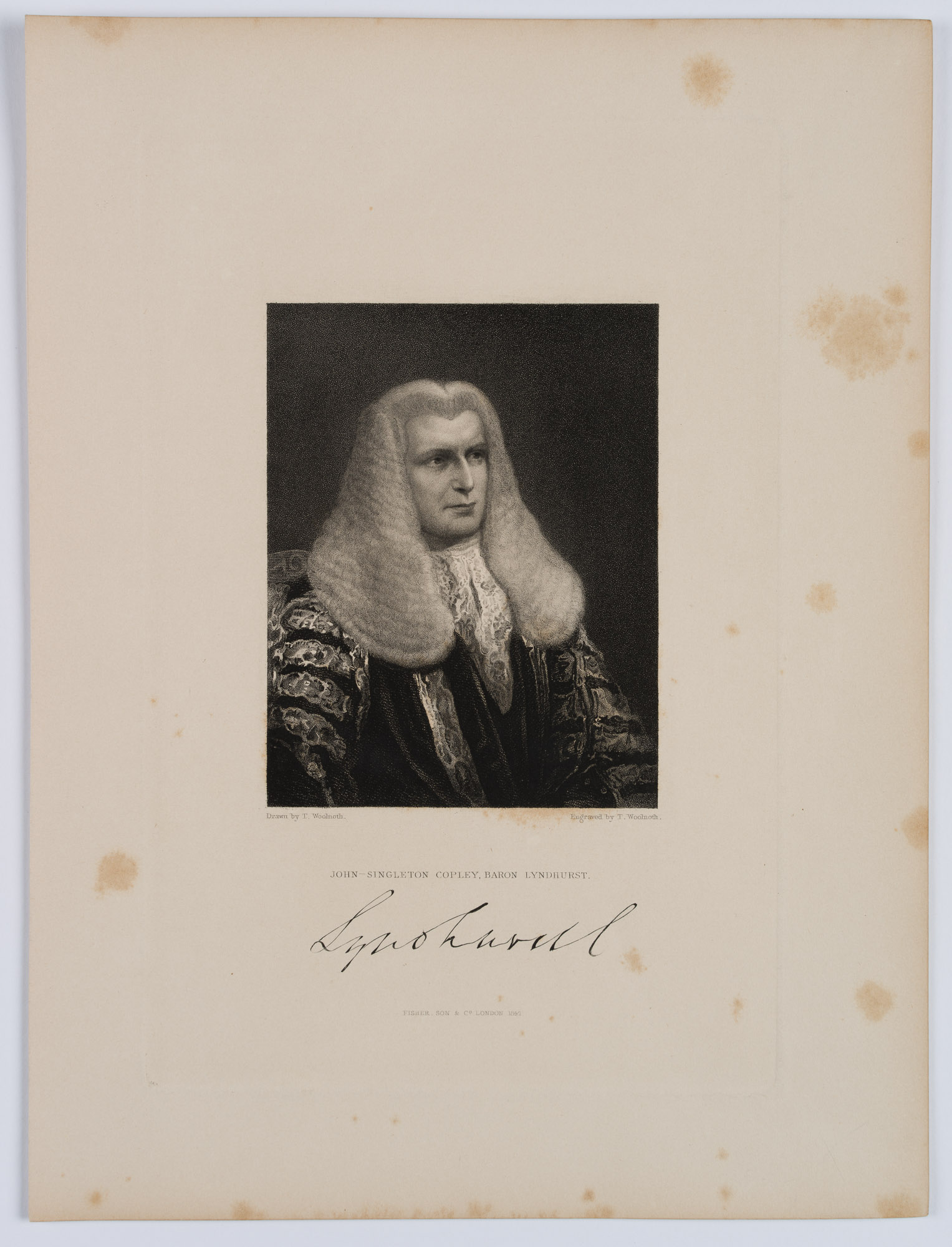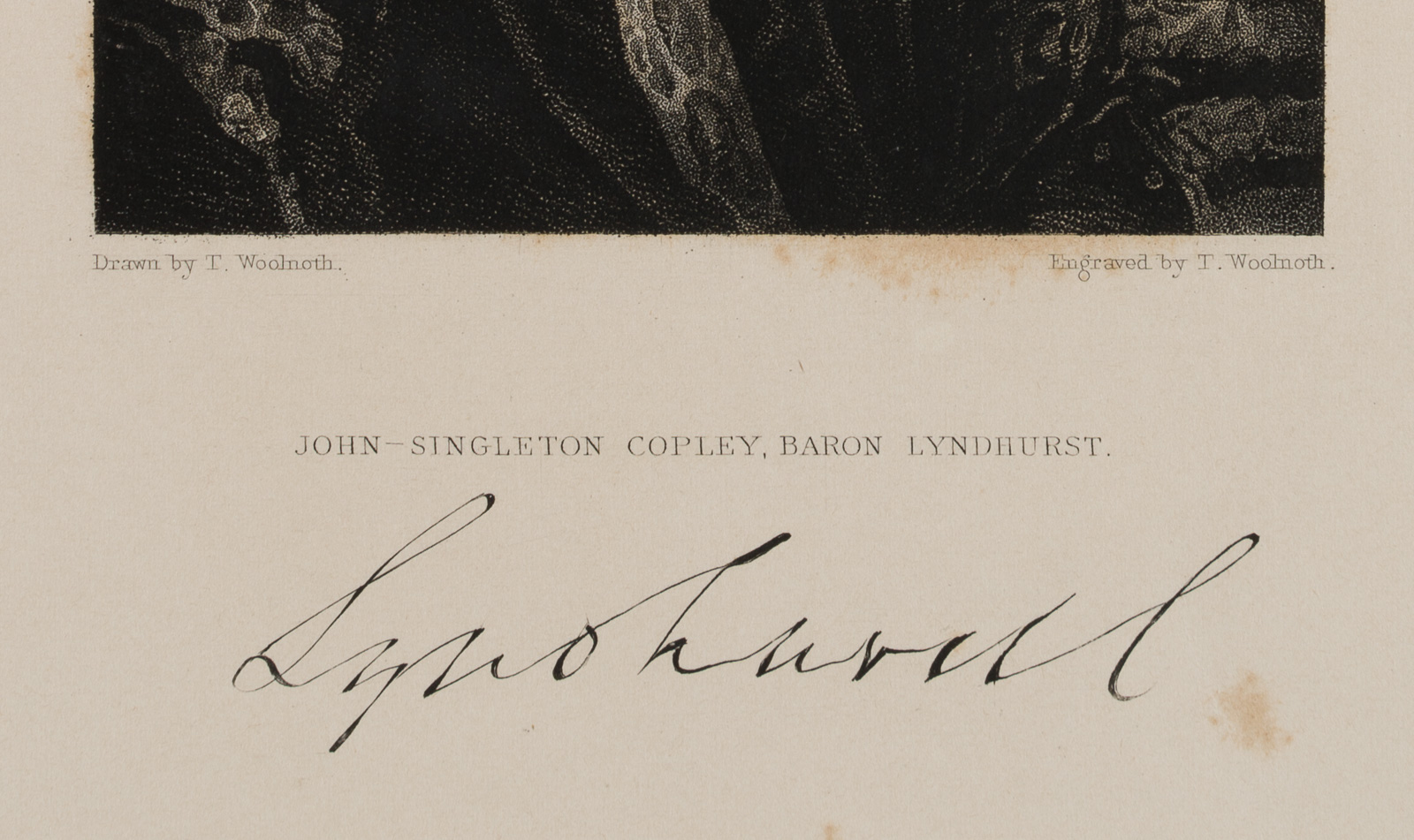 - Description: Signed and inscribed below the depiction: “Drawn by T. Woolnoth, Engraved by T. Woolnoth John-Singleton Cobley, Baron Lyndhurst Fisher. Son&C° London 1842”, additionally facsimile signature of the sitter in the plate. Woolnoth portrayed Lyndhurst with a long white wig. It falls impressively on his splendid cloak. Lyndhurst is looking very seriously to the right. The three-quarter profile clearly shows his characteristically curved nose, which gives him a stern appearance. John Singleton Copley, 1st Baron Lyndhurst was born in Boston, Massachusetts in 1772, the son of the portrait painter John Sigleton Copley. His family moved to England at an early age. Copley studied theology and