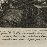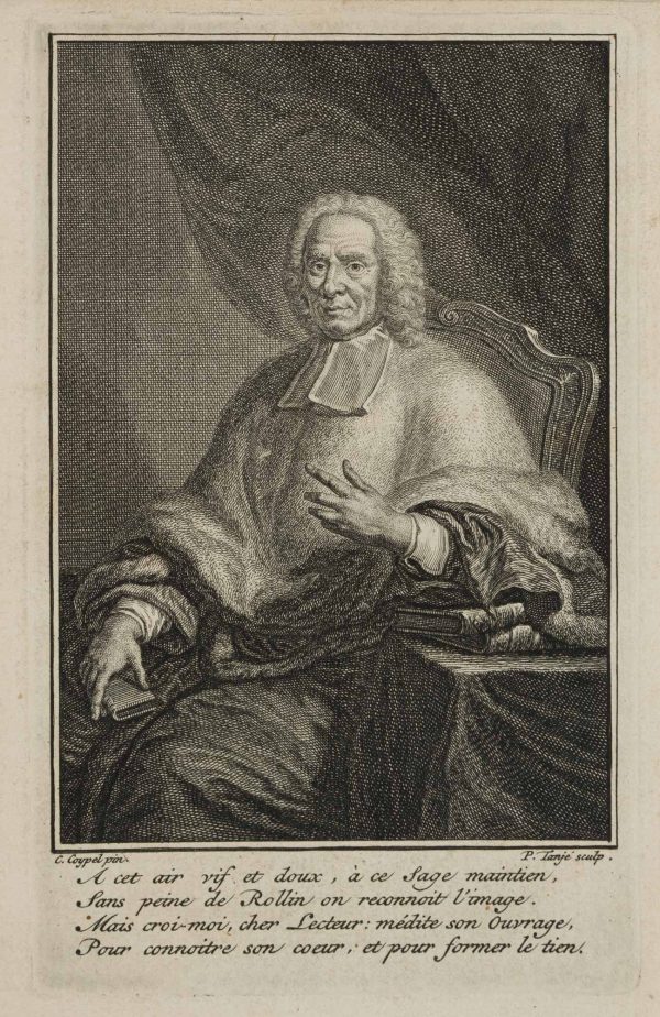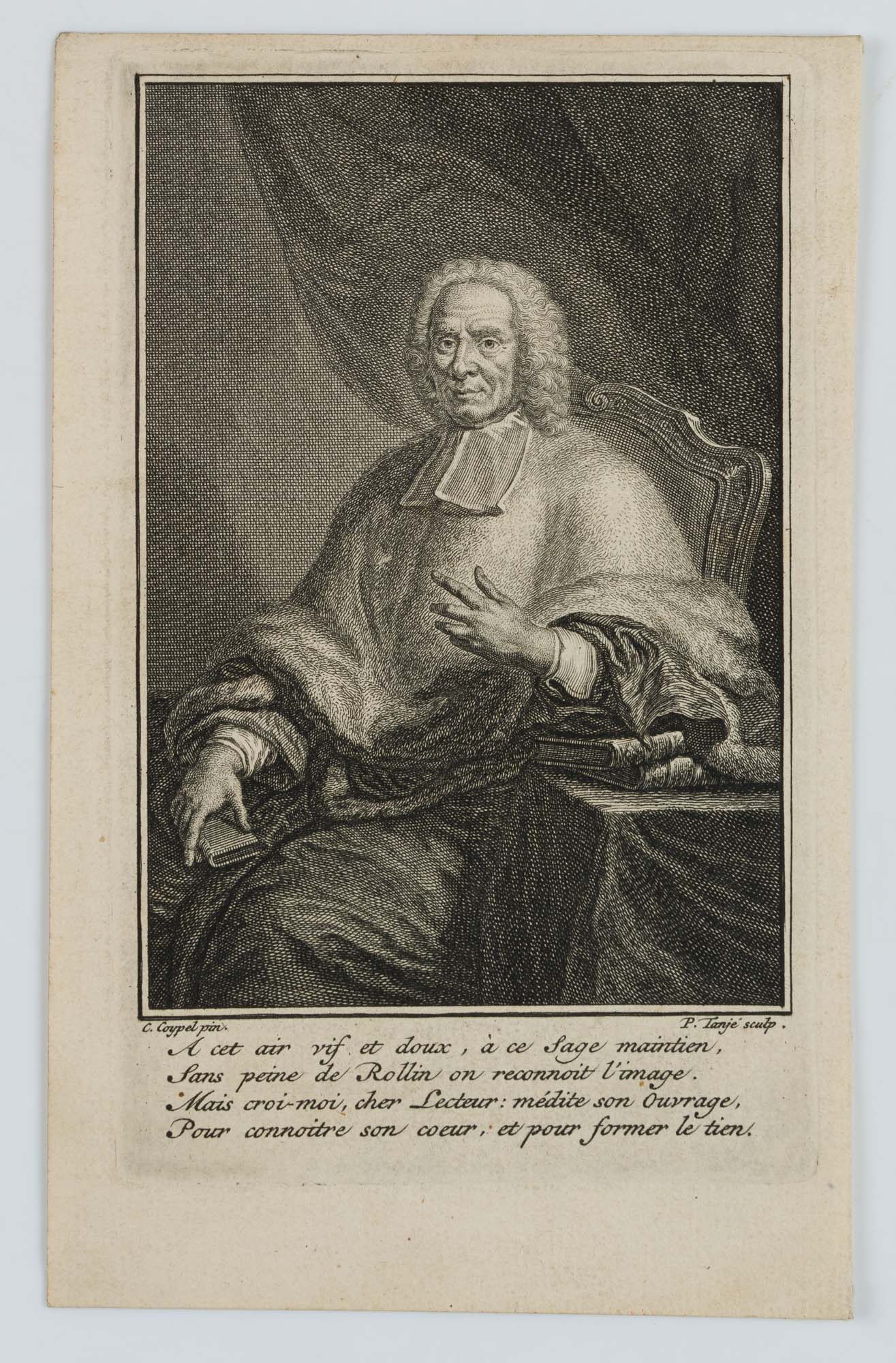 - Inscription: Unten innerhalb der Druckplatte signiert “C. C. Coypel pinx / P. Tanjé sculp.” und bezeichnet: “A cet air vif et doux, à ce sage maintien, // Sans peine de Rollin on reconnoit l’image // Mais croi-moi, cher Lecteur; médite son ouvrage, // Pour connoitre son coeur, et pour former le tien.”
