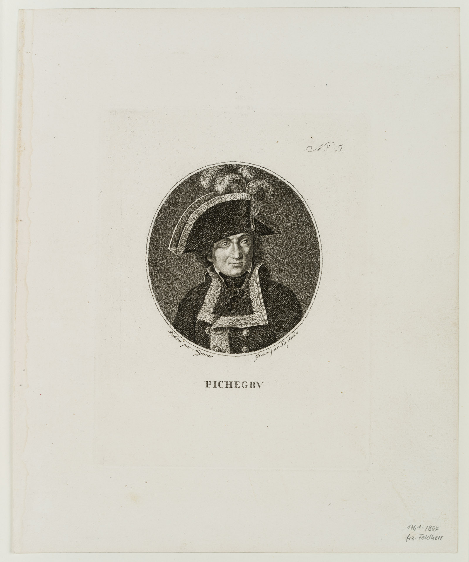 Porträt des Jean-Charles Pichegru (1761 Arbois-1804 Paris), französischer General der Revolutionskriege; 1793 zum Général de division befördert; bei der Eroberung der österreichischen Niederlande und Holland kam ihm eine führende Rolle zu; er konspirierte später mit den Gegenrevolutionären und plante ein Attentat gegen Napoleon Bonaparte.; Ehrungen: Am Triumphbogen in Paris ist in der dritten Spalte sein Name eingetragen, in Arbois wurde ihm 1816 eine Statue errichtet. - Datierung: 19. Jahrhundert