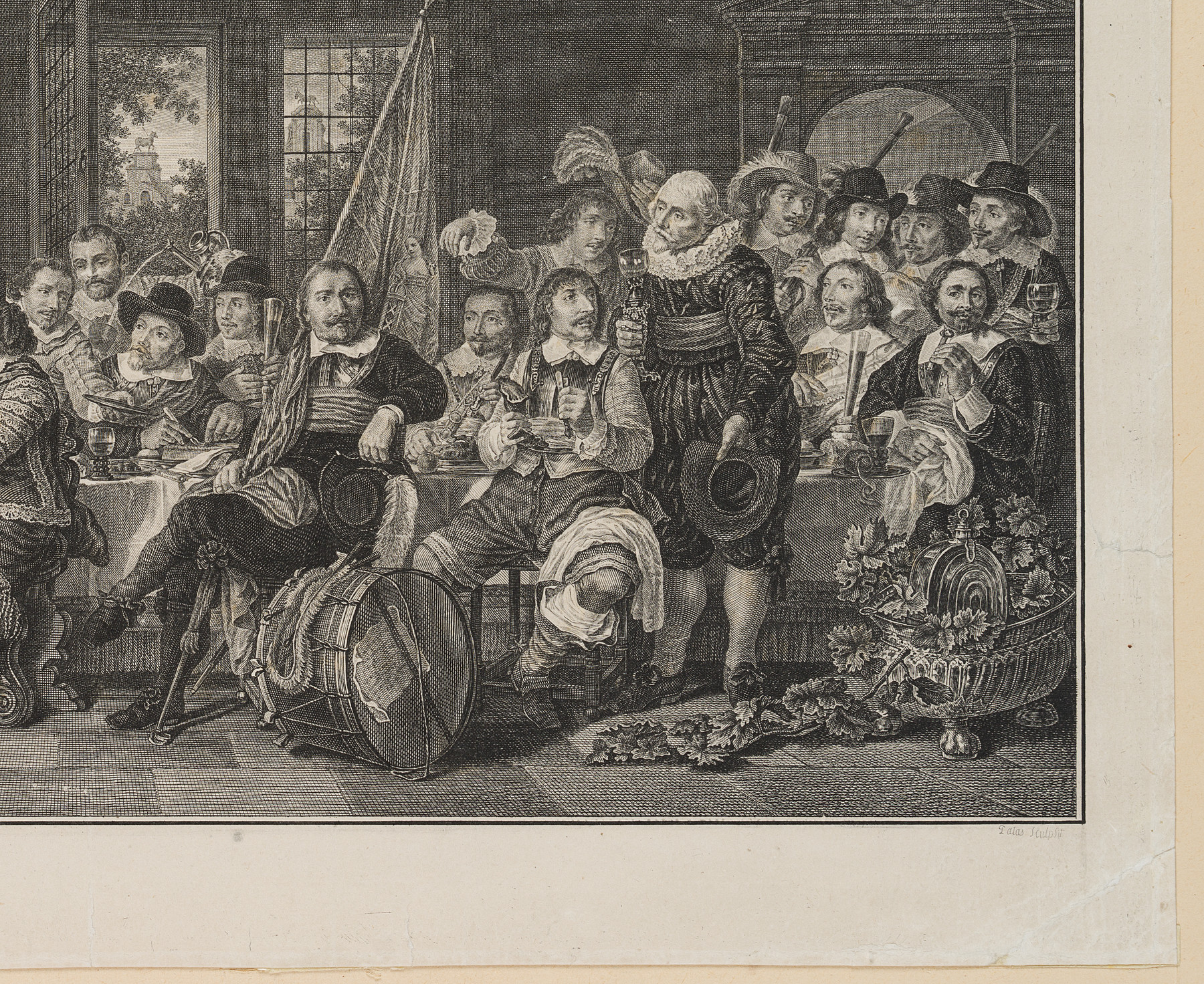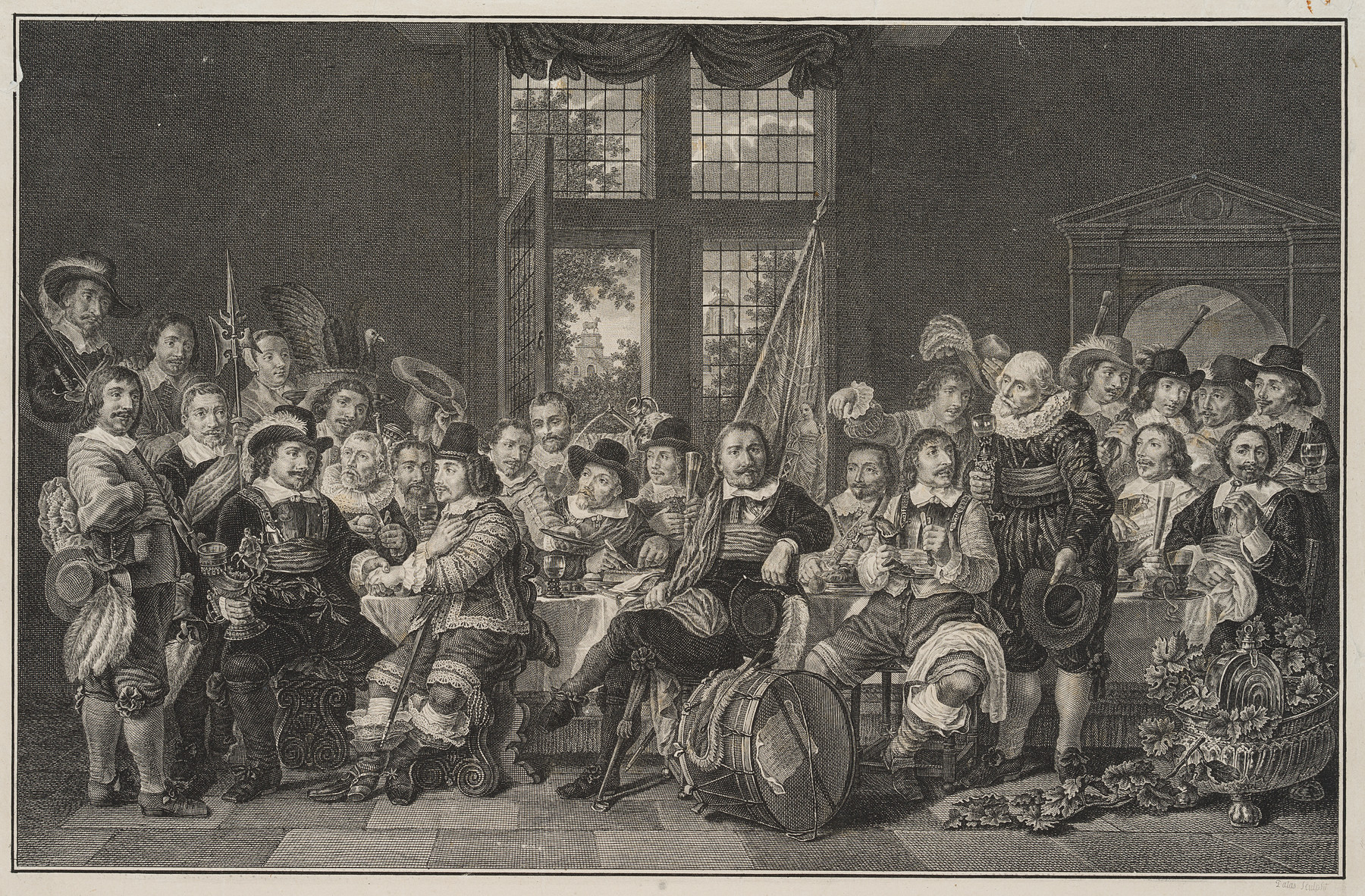 • Beschreibung: Darstellung einer üppigen Festtafel mit niederländischen Edelmännern in der Tracht des 17. Jahrhunderts. Eine alte Zuschreibung tauft das Werk “Schützengilde”, vermutlich in Anlehnung an Rembrandts Schützenstück “Nachtwache”.