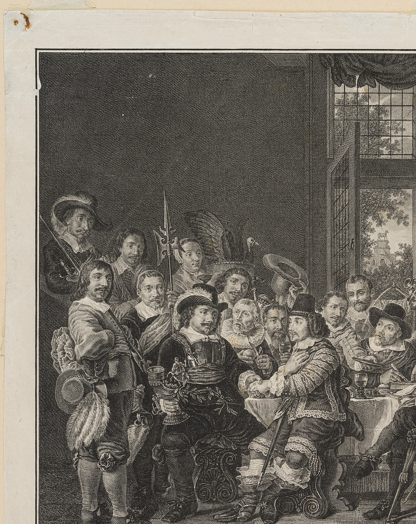 • Description: Depiction of a lavish banquet table with Dutch noblemen in 17th century costume. An old attribution christens the work “Schützengilde”, presumably in reference to Rembrandt’s Schützenstück “Nachtwache”.