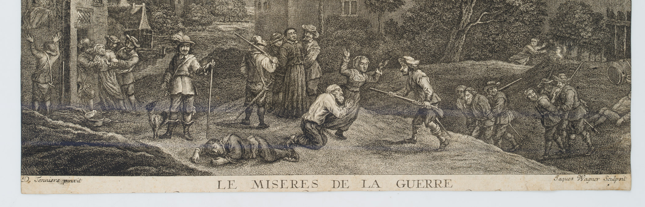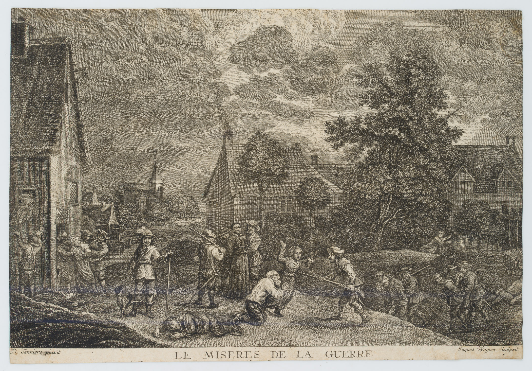 - Beschreibung: Unter der Darstellung mittig betitelt mit: “Le Miseres De La Guerre” mit marodierenden Soldaten. Daneben links und rechts signiert mit “D. Tenniers pinxit” und “Jaques Wagner Sculpsit”.