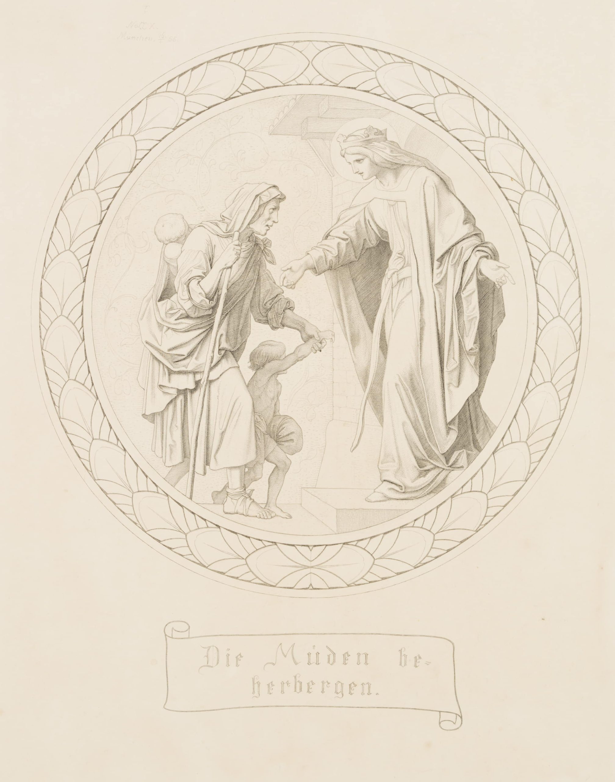 Julius Cäsar Thaeter (1804 Dresden – 1870 Munich) after Moritz von Schwind (1804 Vienna – 1871 Munich), 7 Works of Mercy, Lodging the Weary, 1855, Copper engraving