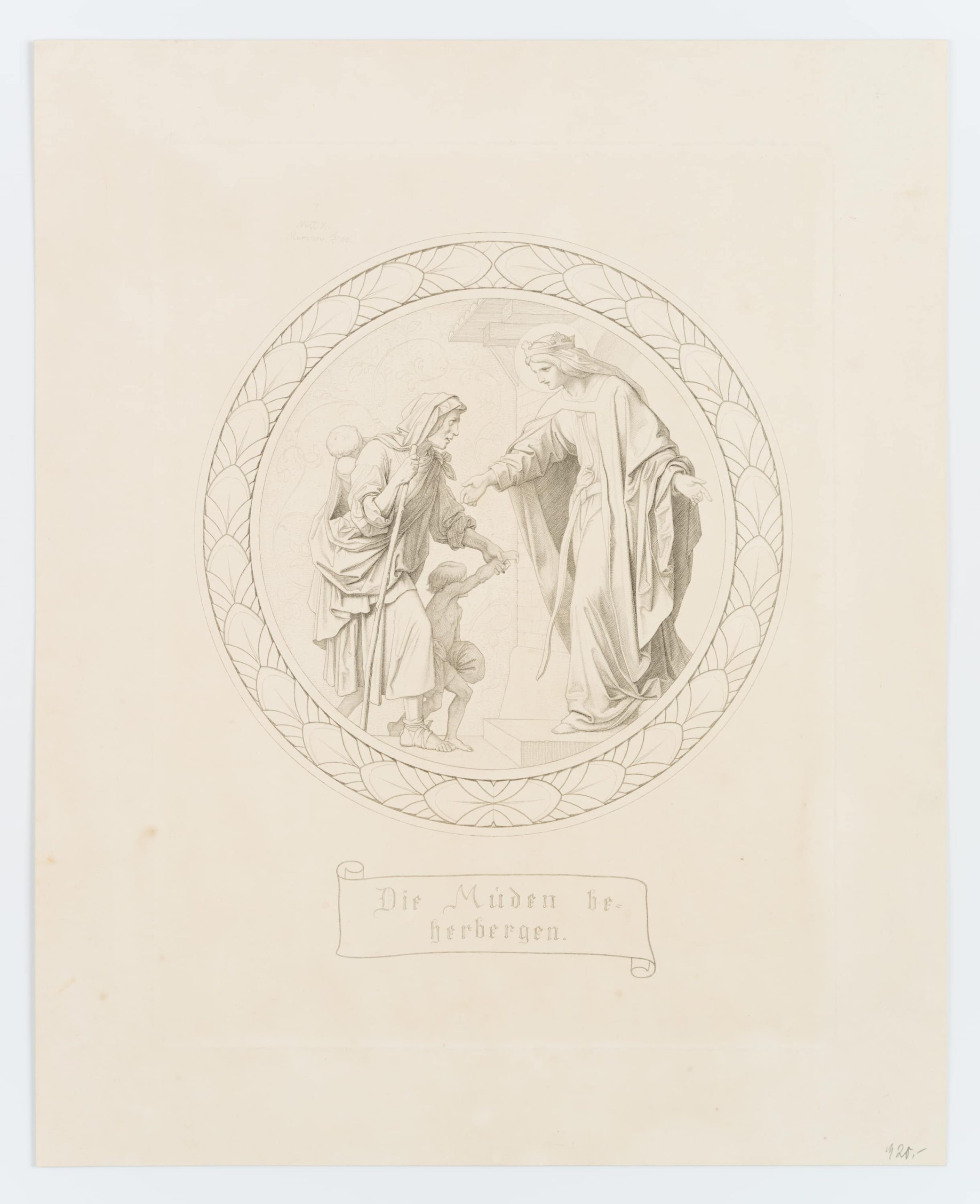 Julius Cäsar Thaeter (1804 Dresden – 1870 München) nach Moritz von Schwind (1804 Wien – 1871 München), 7 Werke der Barmherzigkeit, Die Müden beherbergen, 1855, Kupferstich