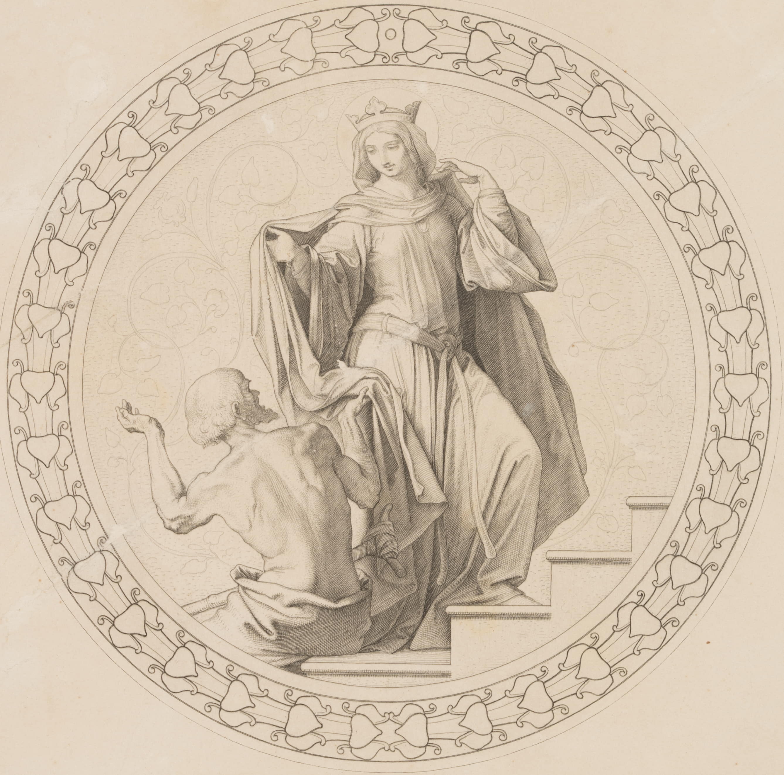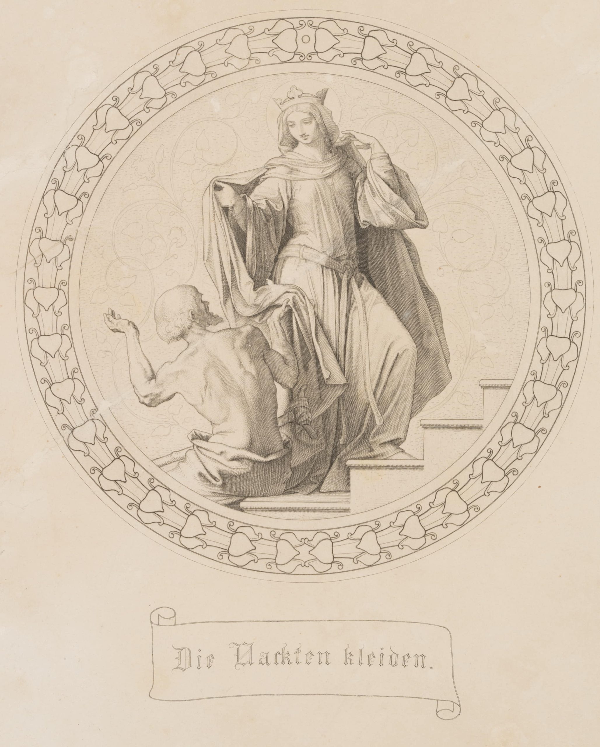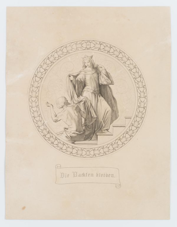 Julius Cäsar Thaeter (1804 Dresden – 1870 Munich) after Moritz von Schwind (1804 Vienna – 1871 Munich), After Moritz von Schwind (1804-1871): 7 Works of Mercy, Clothe the naked, c. 1855, Copper engraving