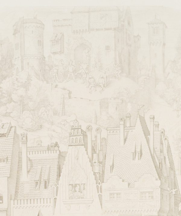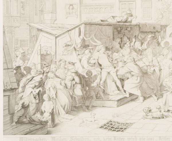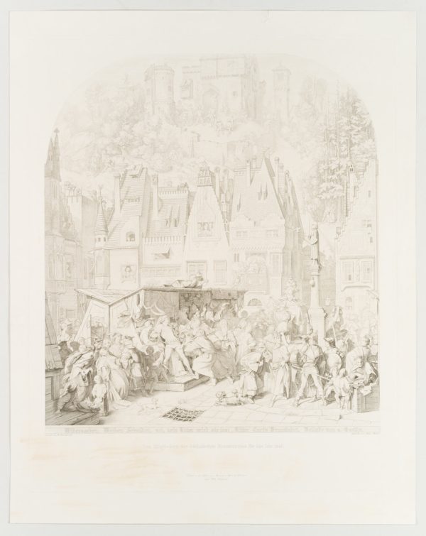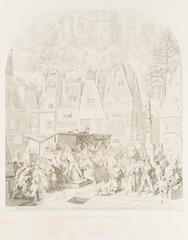 After a painting by Moritz von Schwind (1804 Vienna – 1871 Pöcking). In different areas of the painting, four scenes can be seen that follow each other independently, in time and place. The painting follows a poem by Johann Wolfgang von Goethe from 1802 with the same title. The detail shows the lower centre of the picture, in which the protagonist Ritter Curt (also Kurt) is approached by a crowd at a market stall.
