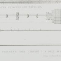 - Bezeichnung: Oben rechts innerhalb der Druckplatte nummeriert “90.”. Zwei Darstellungen auf einem Blatt: a) Fenster zwischen den Türmen und b) Fenster an der Altarnische.