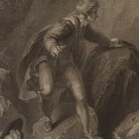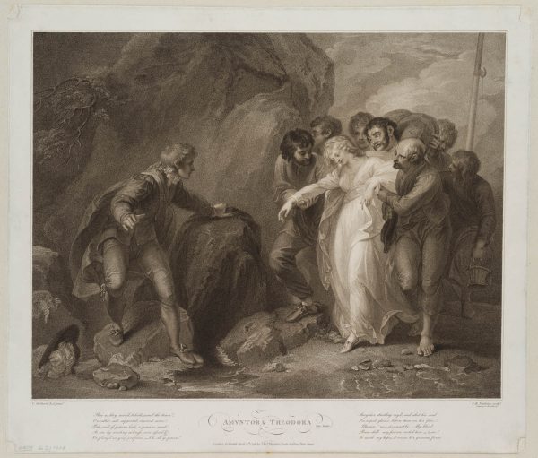 - Description: Based on a poem by David Mallet: “Amyntor and Theodora: Or, the Hermit, a Poem in Three Cantos.” from 1748. The scene takes place on a rocky shore where a young man is just emerging from behind a rock to meet a young woman coming towards him; she is supported by several men, some of whom are carrying bundles and baskets; the mast of a boat can be seen in the background on the right.