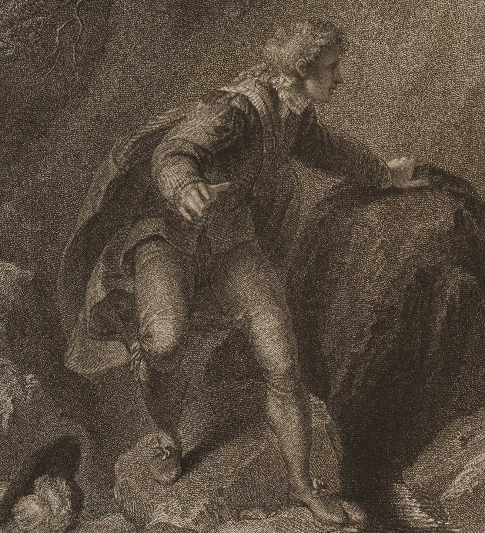 - Beschreibung: Nach einem Gedicht von David Mallet: “Amyntor and Theodora: Or, the Hermit, a Poem in Three Cantos.” aus dem Jahre 1748. Die Szene spielt sich an einem felsigen Ufer ab, wo gerade ein junger Mann hinter einem Fels hervortritt, um auf eine junge Frau zu stoßen, die auf ihn zukommt; sie wird von mehreren Männern gestützt, von denen einige Bündel und Körbe tragen; rechts im Hintergrund ist der Mast eines Bootes zu sehen.