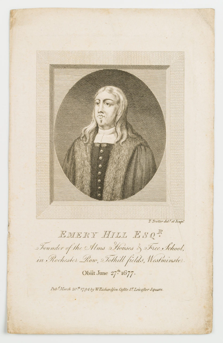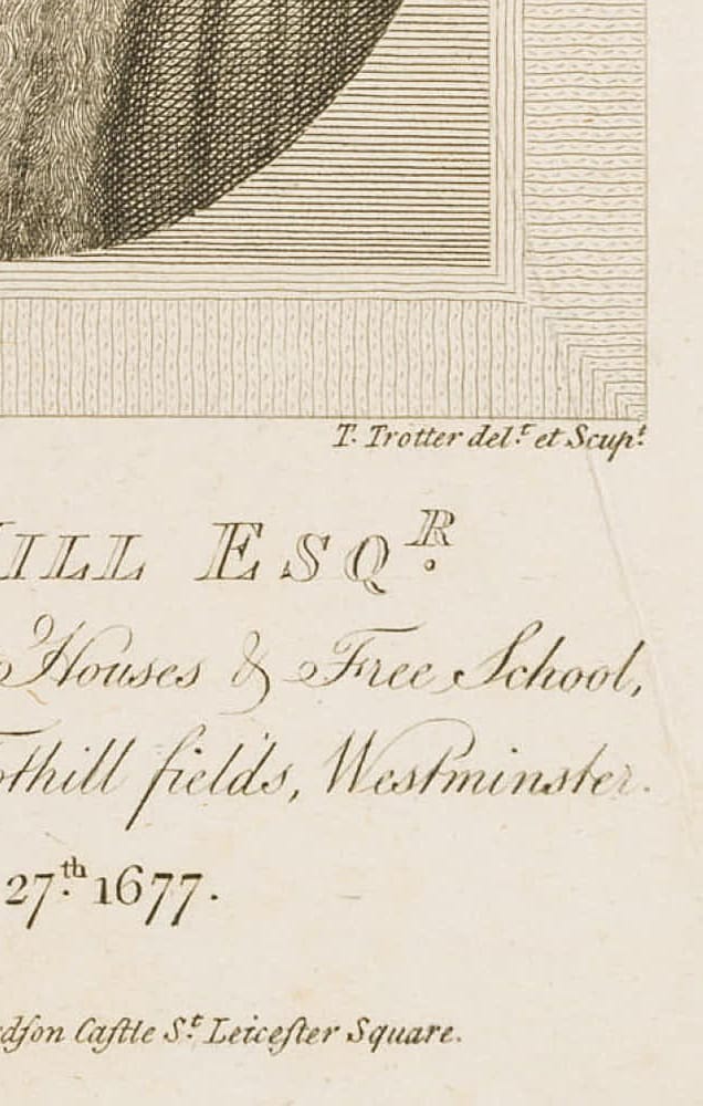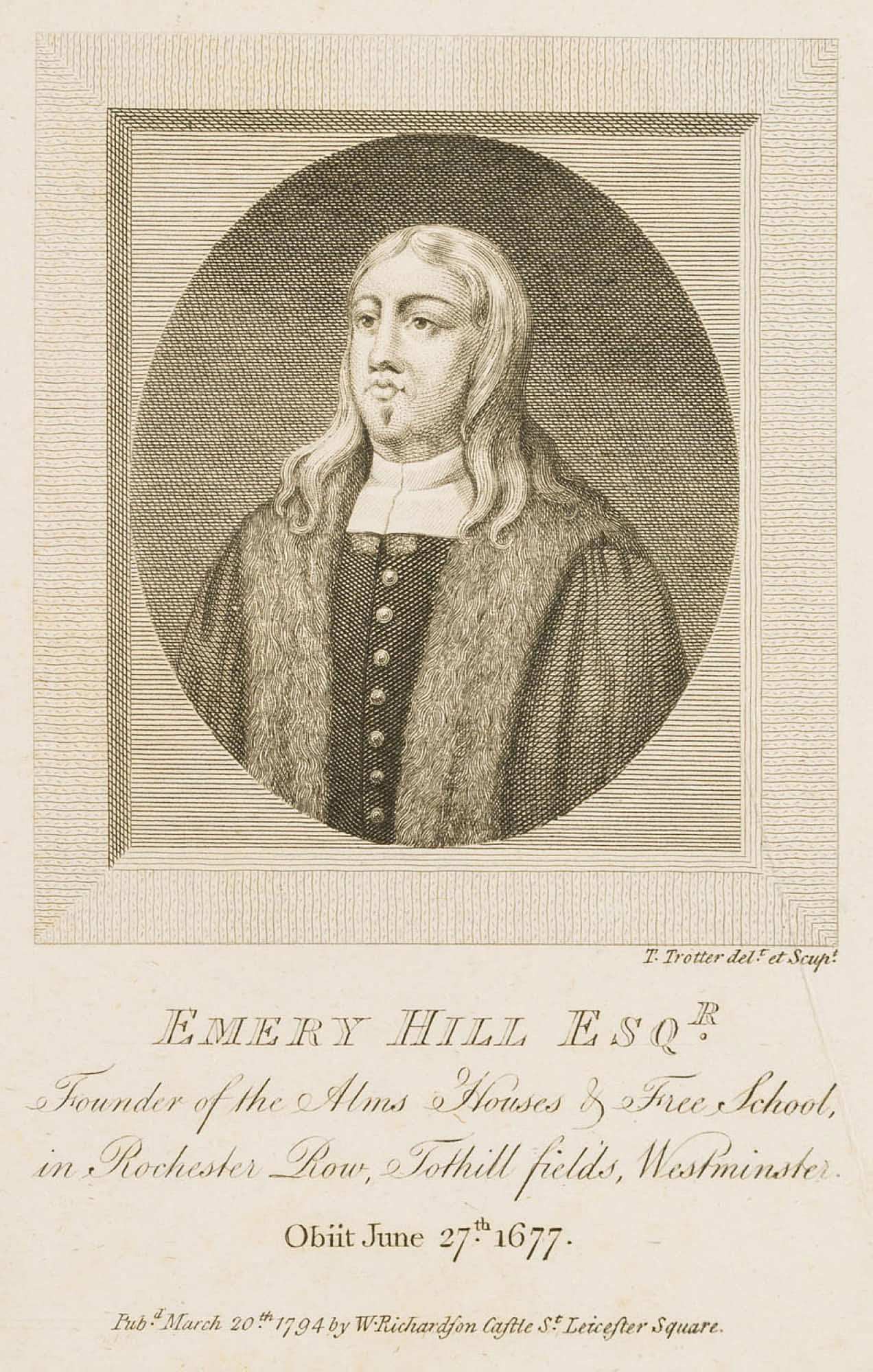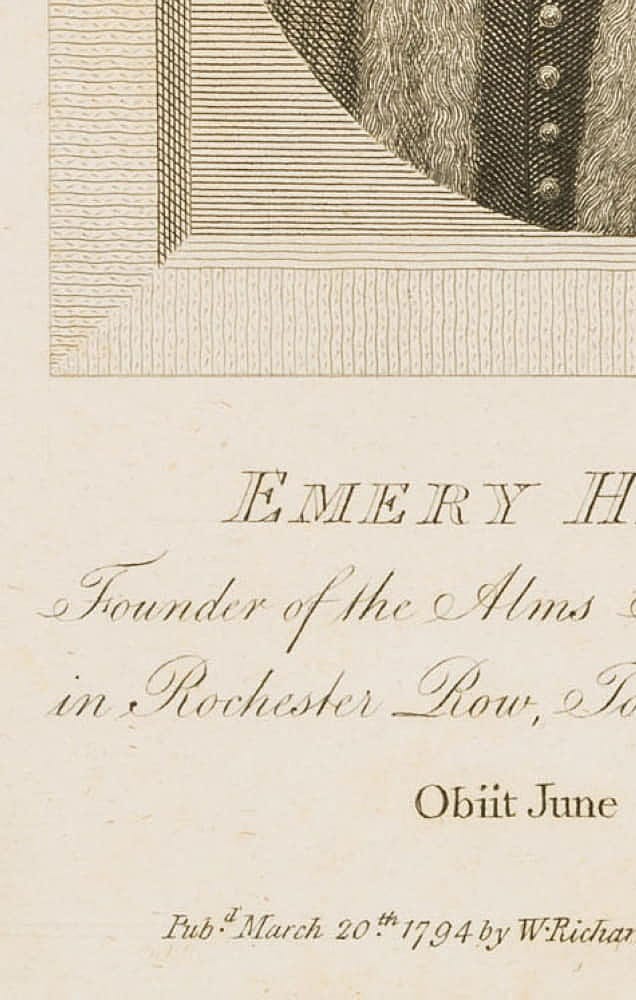 - Bezeichnung: Unten signiert und betitelt: “Emery Hill Esqr. Founder of the Alms Houses & Free School, in Rochester Row, Tothill fields, Westminster. Obiit June 27th 1677.”