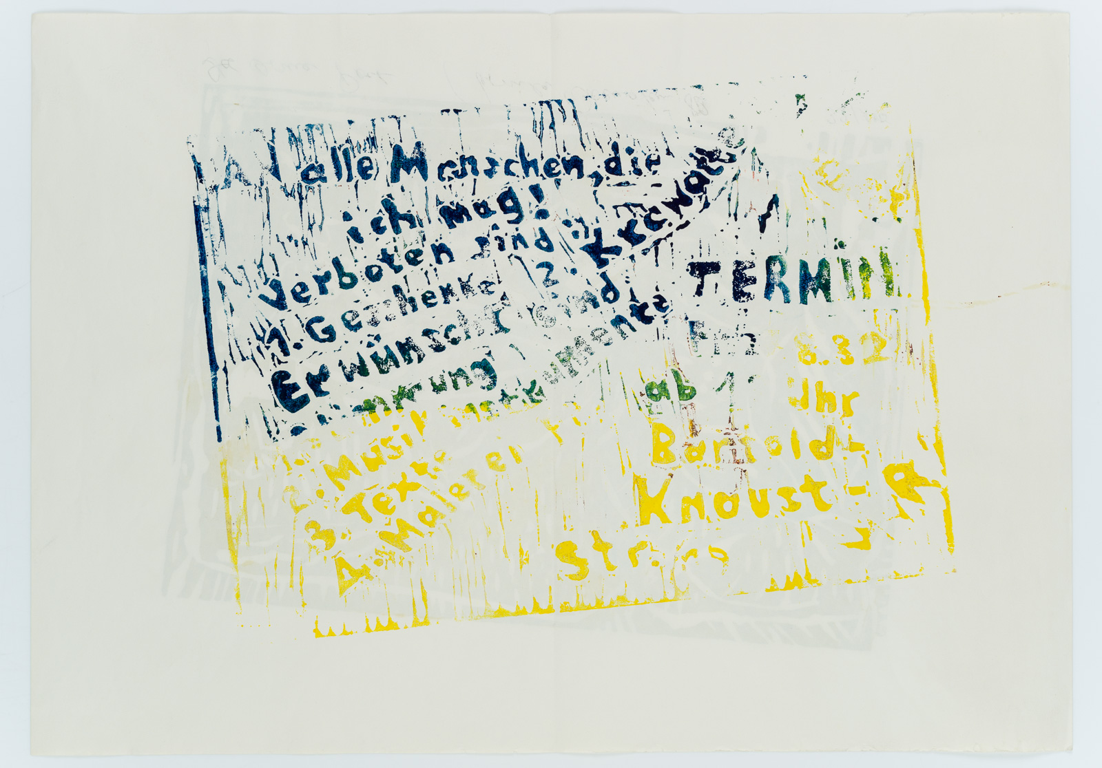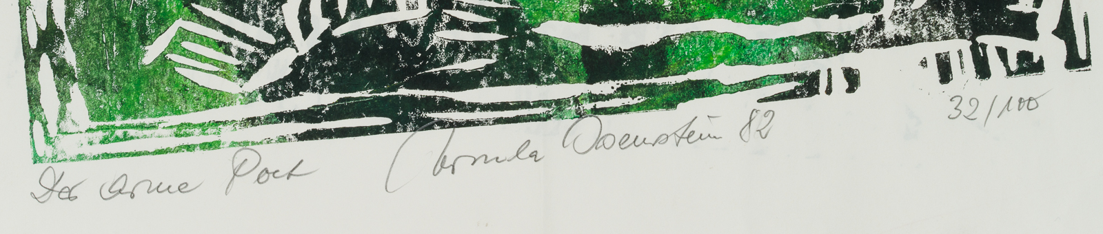 - Bezeichnung: Unterhalb der Graphik beschriftet, signiert, datiert und nummeriert mit: “Der arme Poet | Ursula Osenstein 82 | 32/100”. Auf der Rückseite: Gelb-schwarz gestaltetes Einladungsschreiben.
