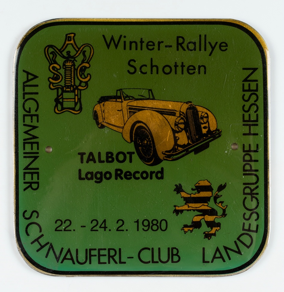Unknown (20. Jahrhundert), Plaque, 10th Winter Rally around Schotten 1980, General Schnauferl Club Hesse, 1980,