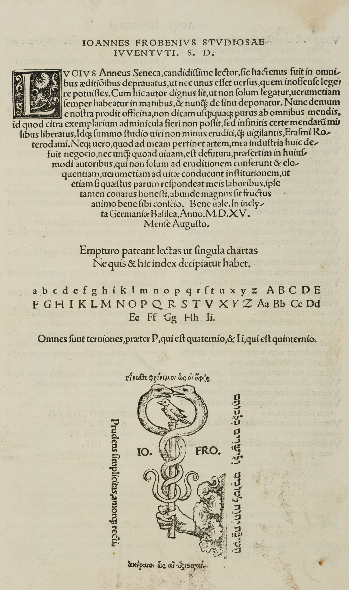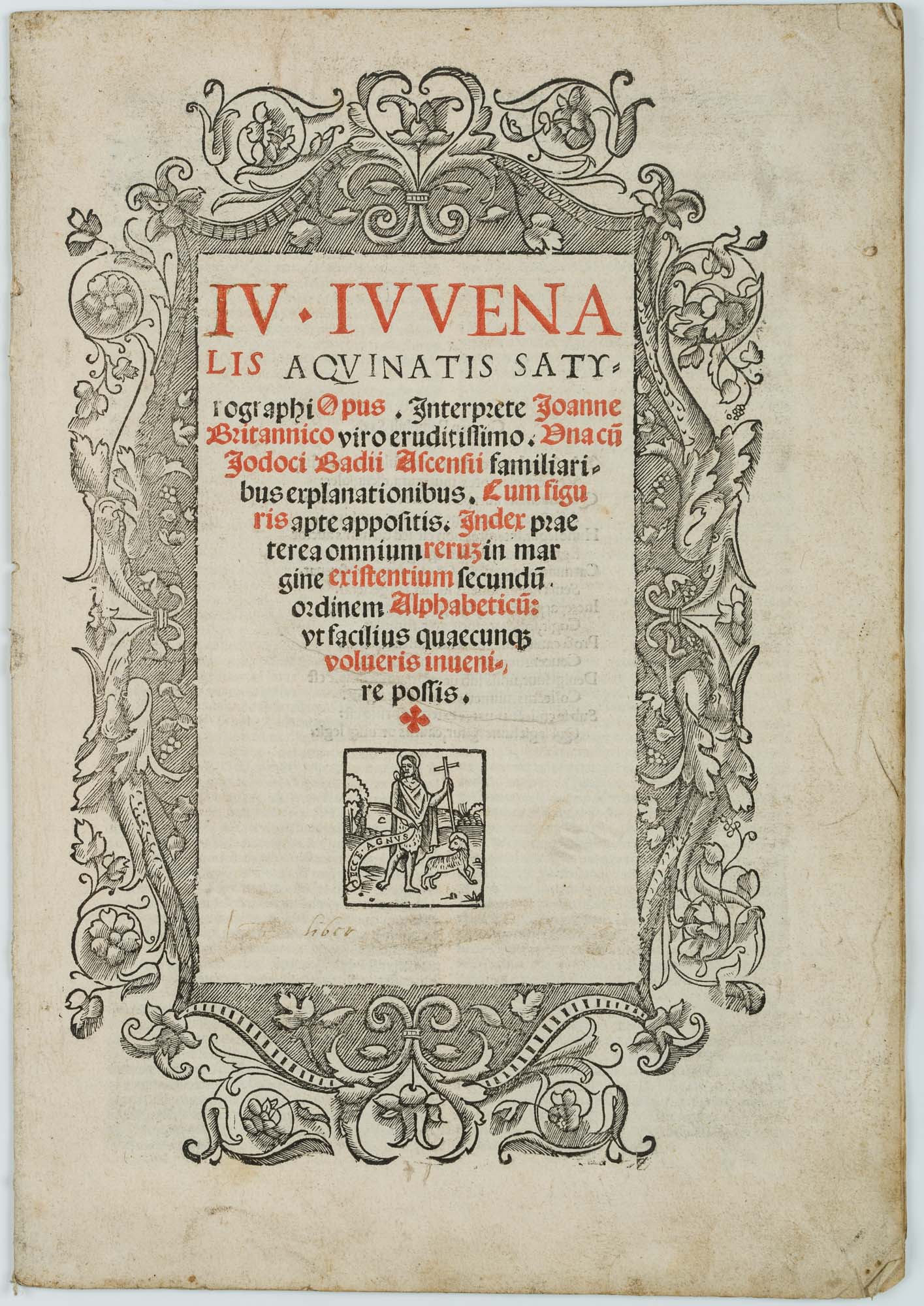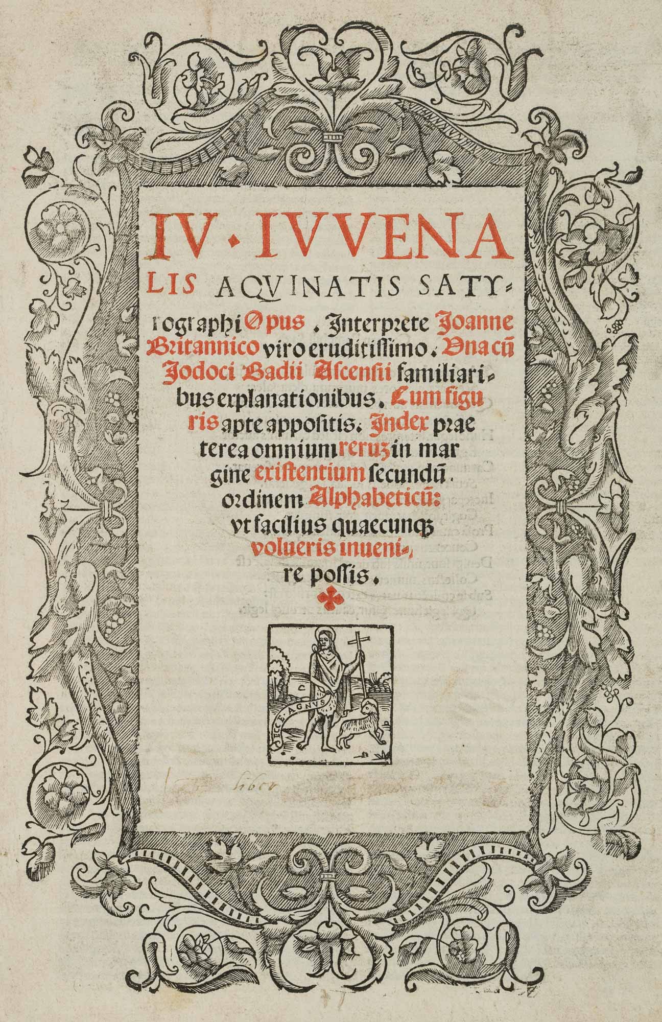Decimus Iunius Iuvenalis, German: Juvenal, was a Roman satirical poet of the 1st and 2nd centuries, probably from Aquinum, whose creative period falls mainly in the time of Hadrian, to whom his seventh satire is addressed. In these satires, Juvenal often criticises various social conditions in a linguistically and stylistically brilliant manner; in fracture printing; first edition: 1522; author: Decimus Iunius Iuvenalis; contributors: Giovanni Britannico, Jodocus Badius Ascensius; publisher: Ex Aedibus Ioannis Tacuni de Tridino. | Watermark: BM - Keywords: before 18th century, Baroque, Portraits, Italy,