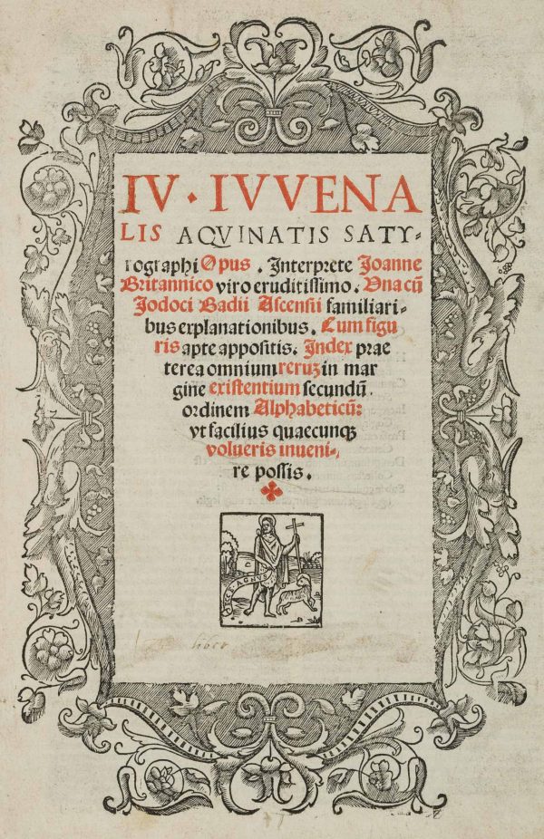 - Description: Typographic print on handmade paper. Rare antiquarian typeface in good condition! Original and early letterpress. Title: “IV. Iuvenalis Aquinatis satyrographi Opus. Interprete Ioanne Britannico viro eruditissimo. Una cum Iodoci Badii Ascensii familiaribus explanationibus. Cum figuris apte appositis.”