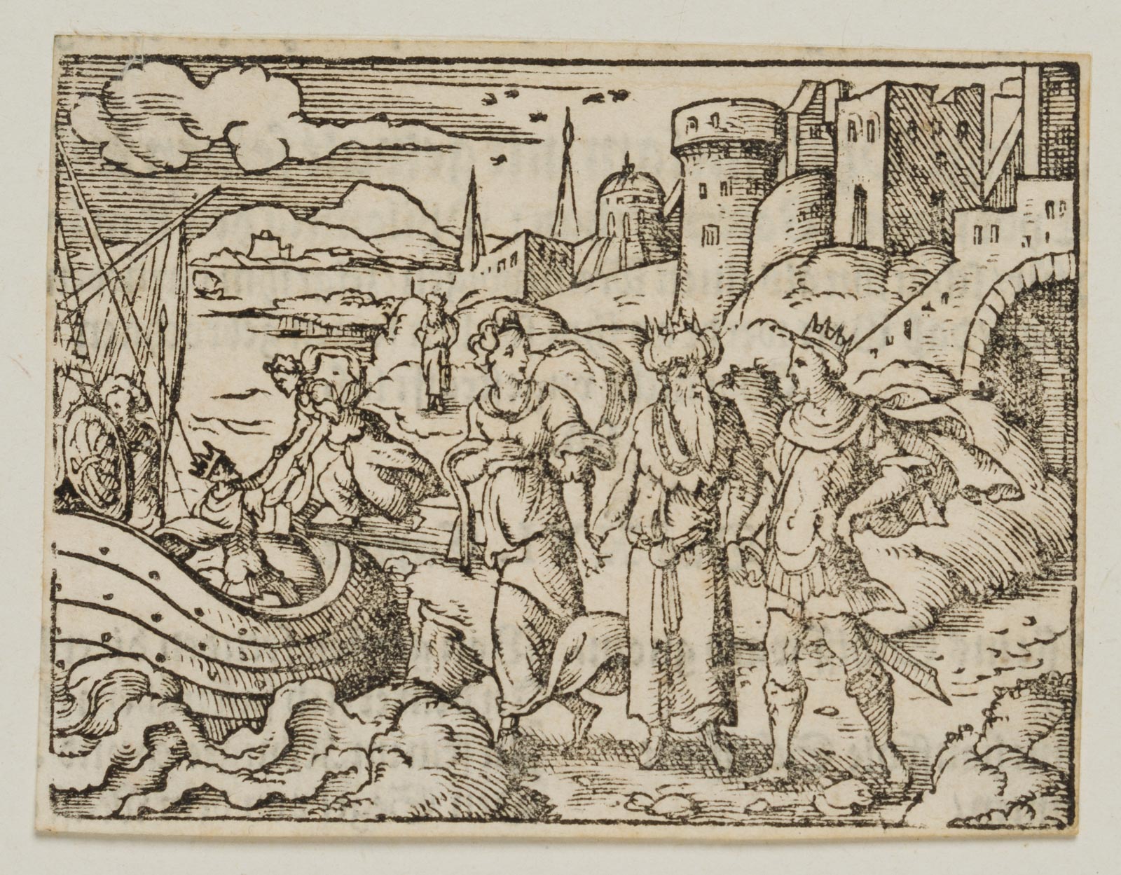 Unknown (16th century), Bible illustration Scene of a royal family leaving the city by boat, , Woodcut