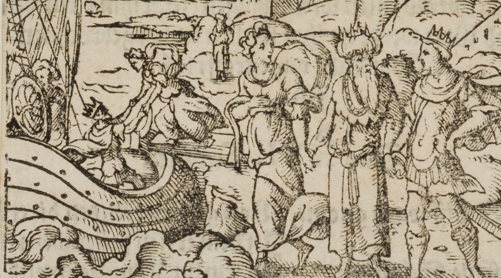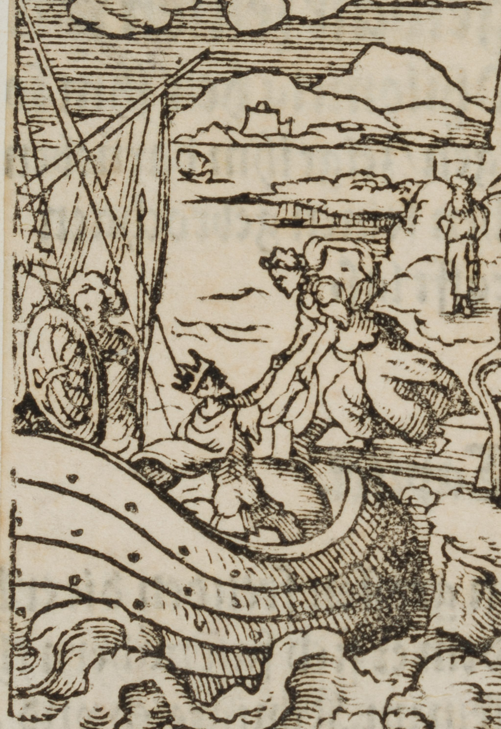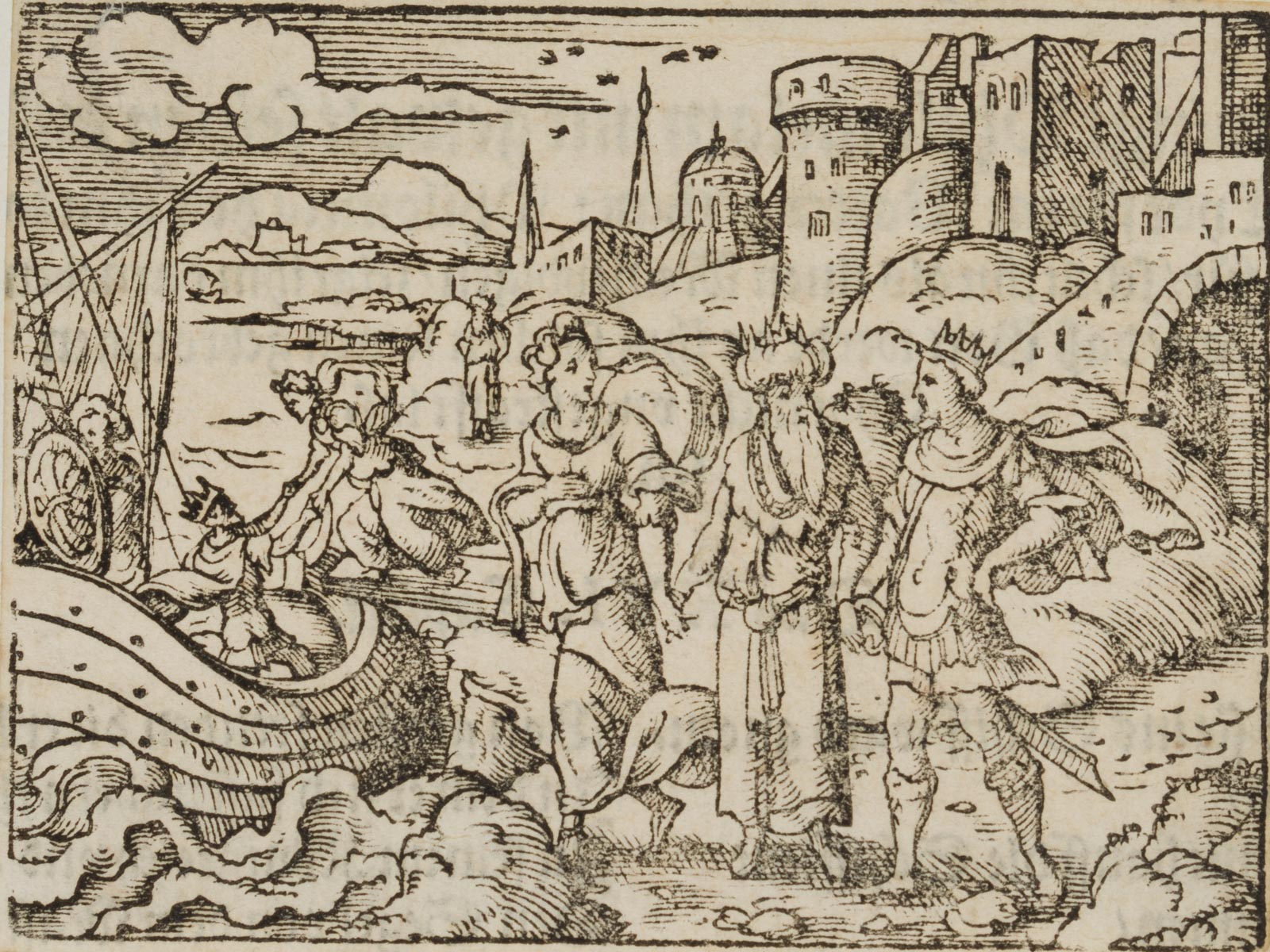 Unbekannt (16. Jahrhundert), Bibelillustration. Szene einer Königsfamillie, die die Stadt mit einem Boot verlässt, , Holzschnitt