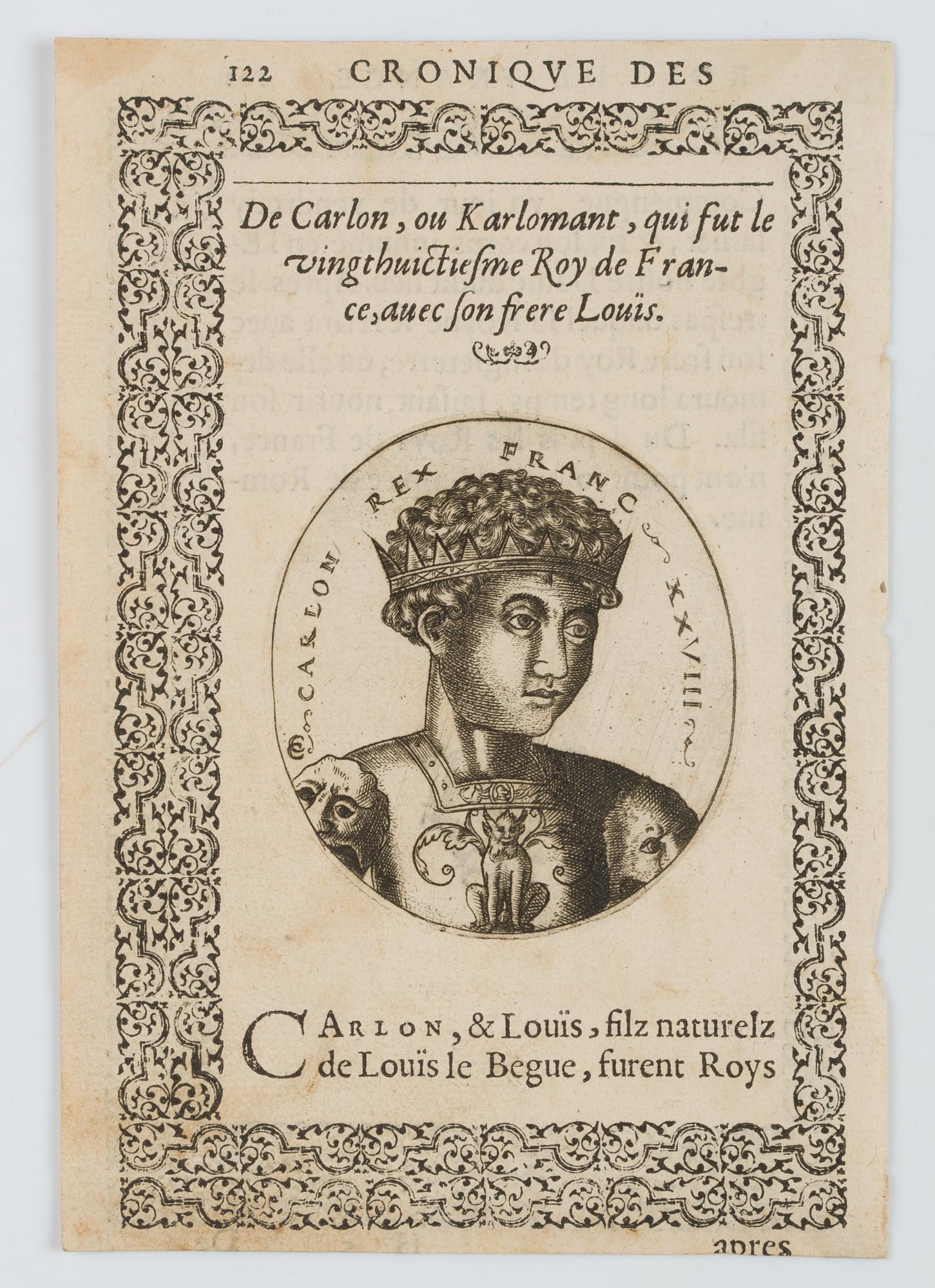 - Description: The sheet shows an ornamentally framed oval miniature portrait of King Carlon (Karlomant). The sheet comes from the book: Cronique sommairement traictee des faictz heroiques de tous les rois de France, & des personnes & choses memorables de leurs temps, edited by Clement Baudin, in Lyon. The book shows a collection of portraits of the kings of France with brief biographies.