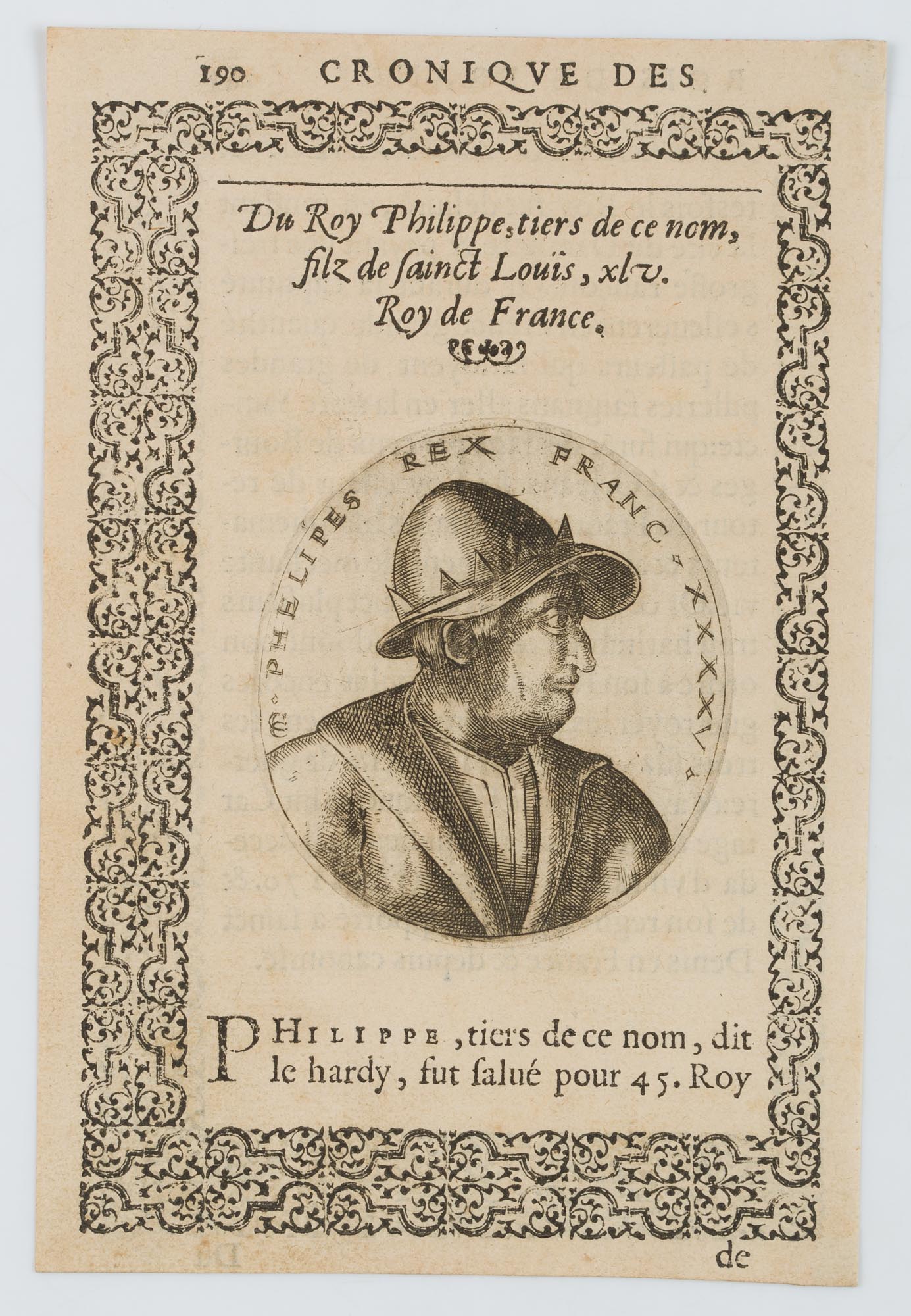 - Beschreibung: Das Blatt zeigt ein ornamental gerahmtes ovales Miniaturporträt des Königs. Das Blatt stammt aus dem Buch: Cronique sommairement traictee des faictz heroiques de tous les rois de France, & des personnes & choses memorables de leurs temps, herausgegeben von Clement Baudin, in Lyon. Das Buch zeigt eine Sammlung von Bildnissen der Könige Frankreichs mit kurzgefassten Lebensläufen.