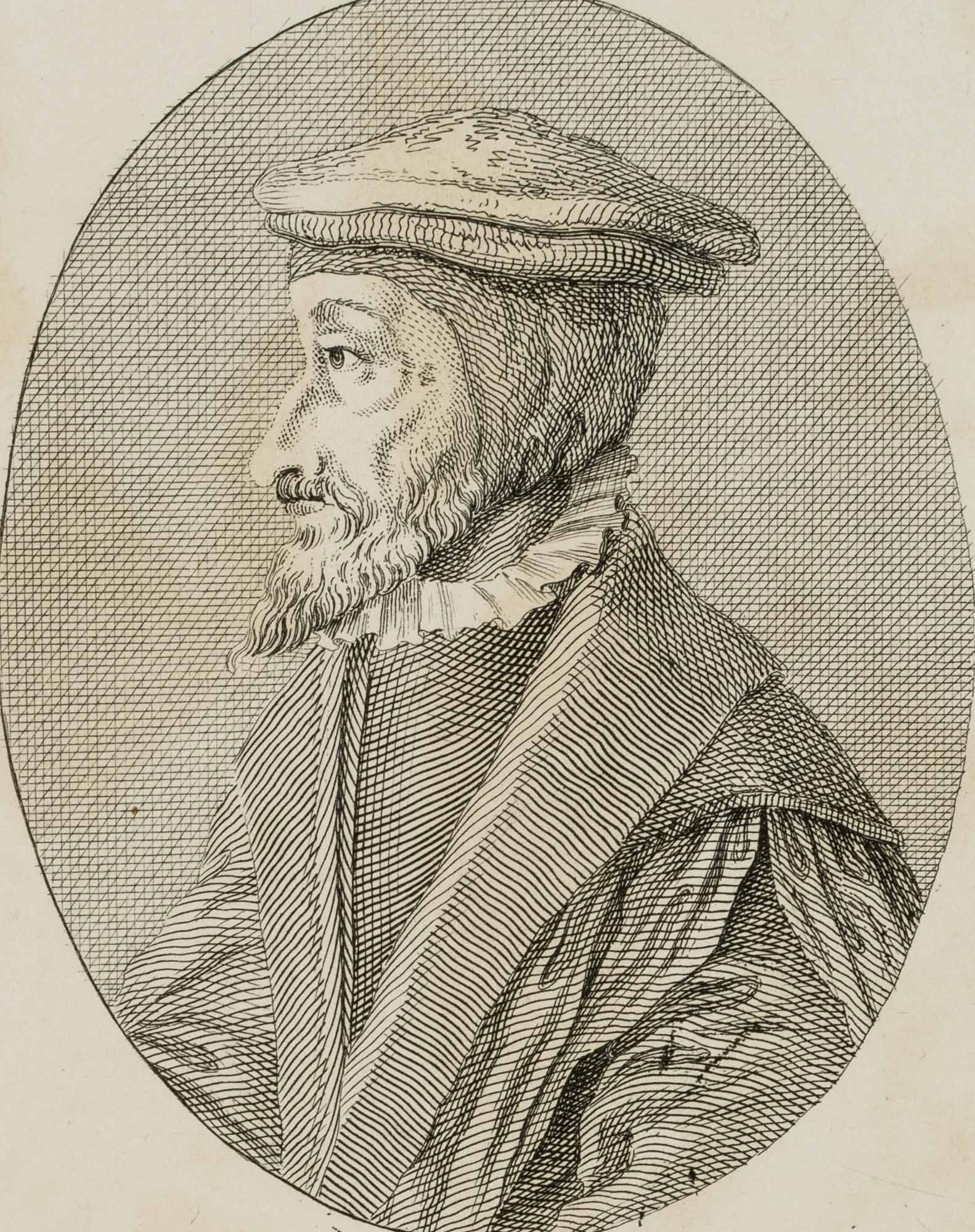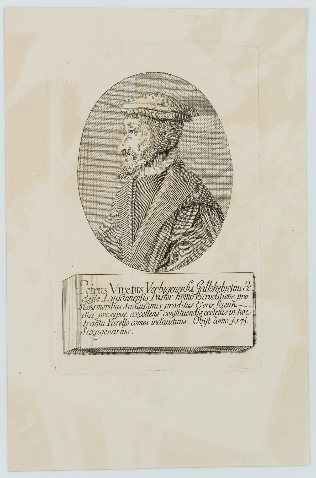 Unter dem Bild bezeichnet mit Titel und sechs Zeilen in Latein. Porträt des Schweizer Reformators Pierre Viret (1511 Orbe-1571 Orthez), der in Genf, Lausanne und Frankreich wirkte; im Oval. Ihn beschäftigten, neben der Auslegung der Bibel, besonders Fragen der (auch politischen) Ethik.