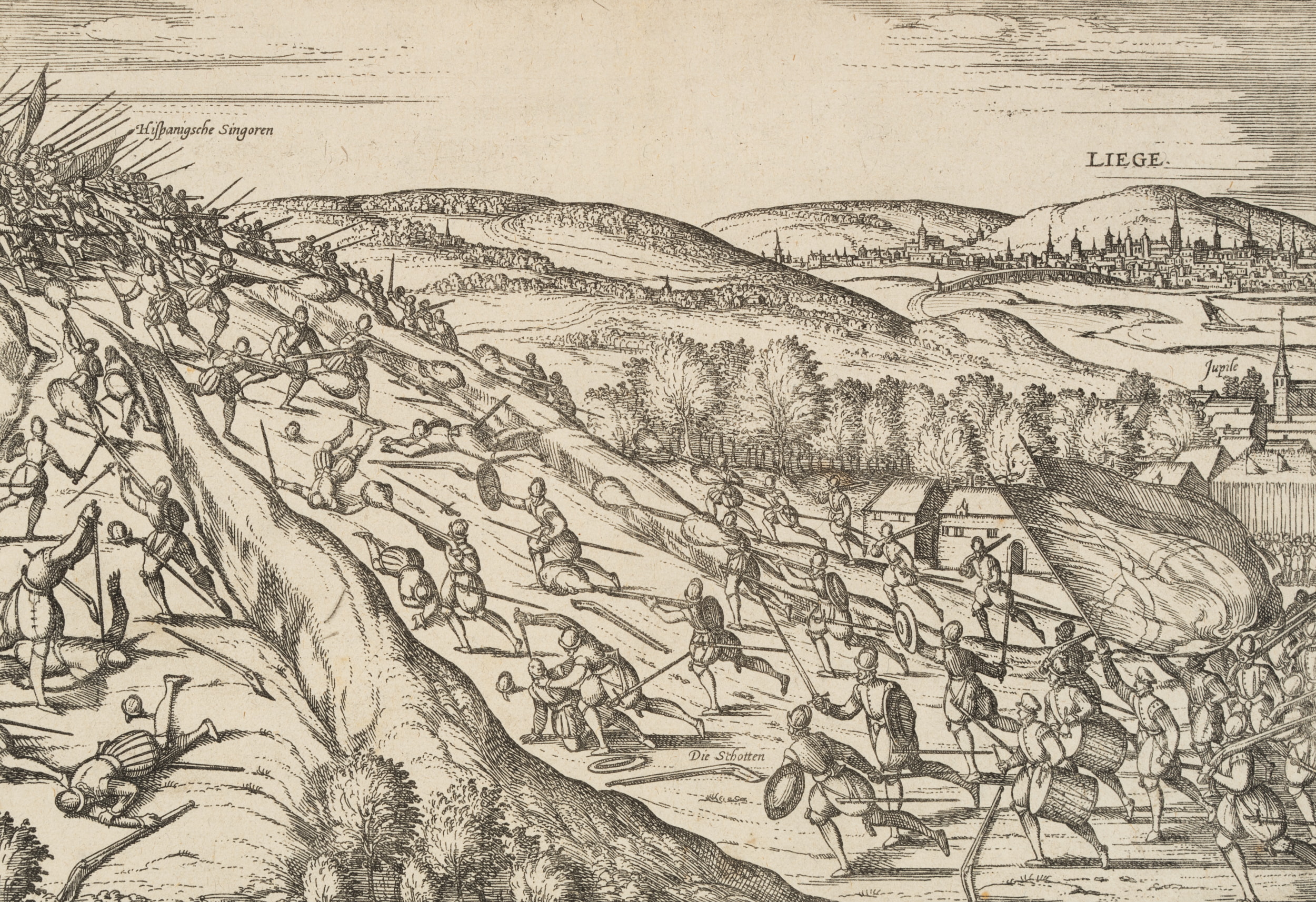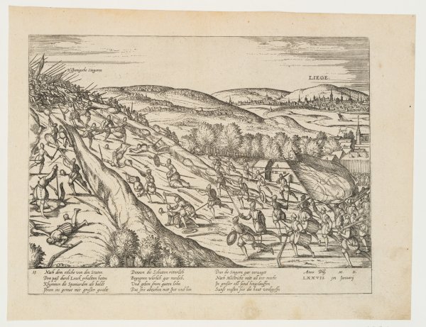 - Description: Battle between the Scottish and Spanish troops outside the city walls of Liège. Below with German verses recounting the event.