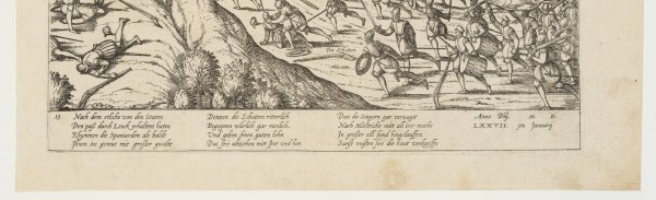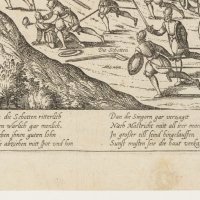 - Beschreibung: Schlacht zwischen den schottischen und spanischen Truppen vor den Stadtmauern Lüttichs. Unterhalb mit deutschen Versen, die von dem Ereignis erzählen.