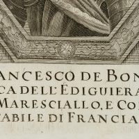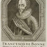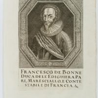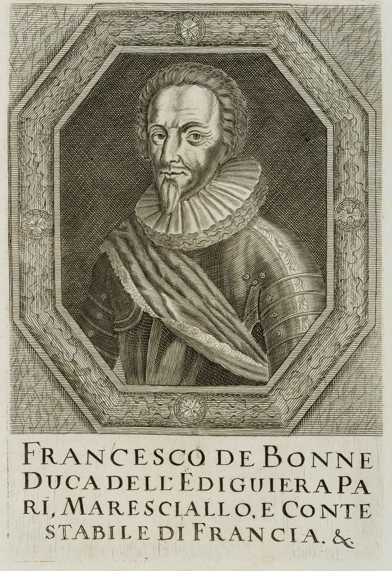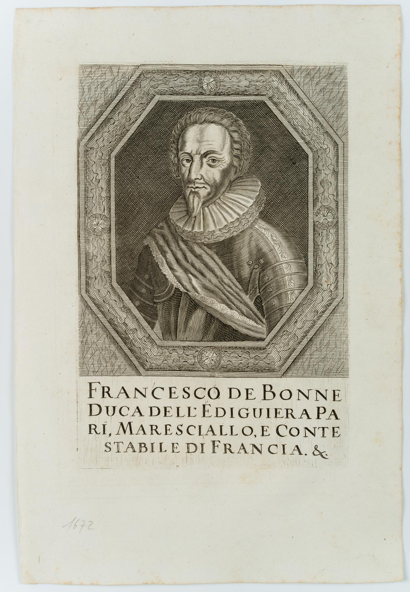 - Description: named below the depiction “Francesco de Bonne Duca dell Edigueria pari, Maresciallo, e Conte stabile di Francia.&.”.