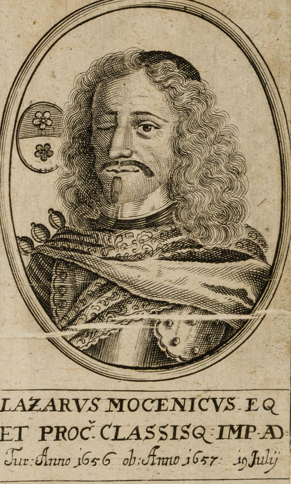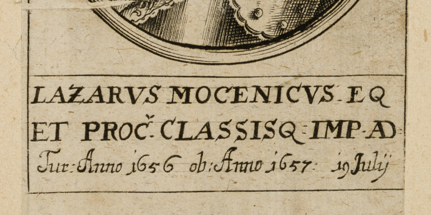 - Bezeichnung: Unterhalb der Graphik mit dem Namen des Dargestellten und dessen Lebensdaten bezeichnet: “LAZARUS MOCENICUS E Q ET PROC. CLASSIQ IMP AD Tur: Anno 1656 ob: Anno 1657 in July”.