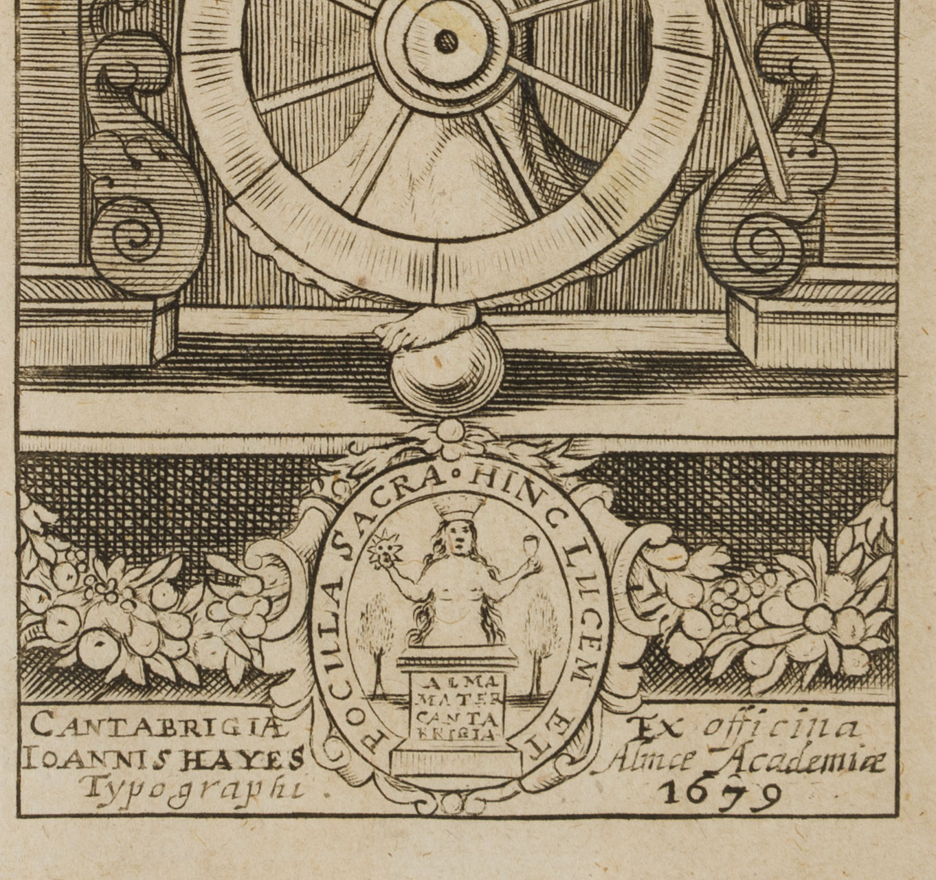 - Bezeichnung: Oben in der Kartusche betitelt, unten bezeichnet “Cantabrigia Ioannis Hayes Typographi / Ex officina Almie Academiae 1679”.